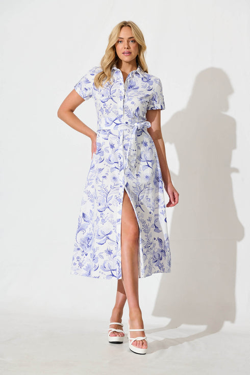 Delphi Midi Shirt Dress in White with Blue Floral Cotton