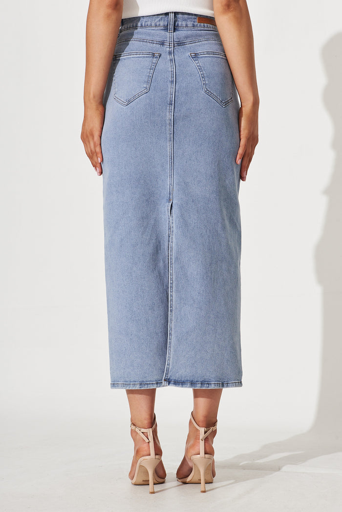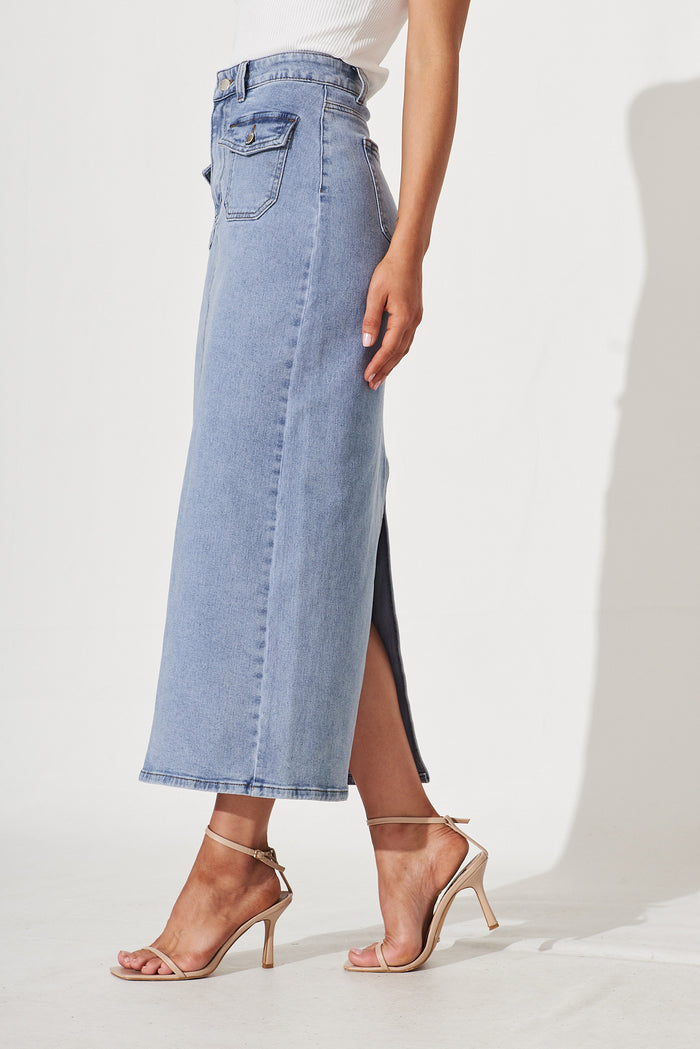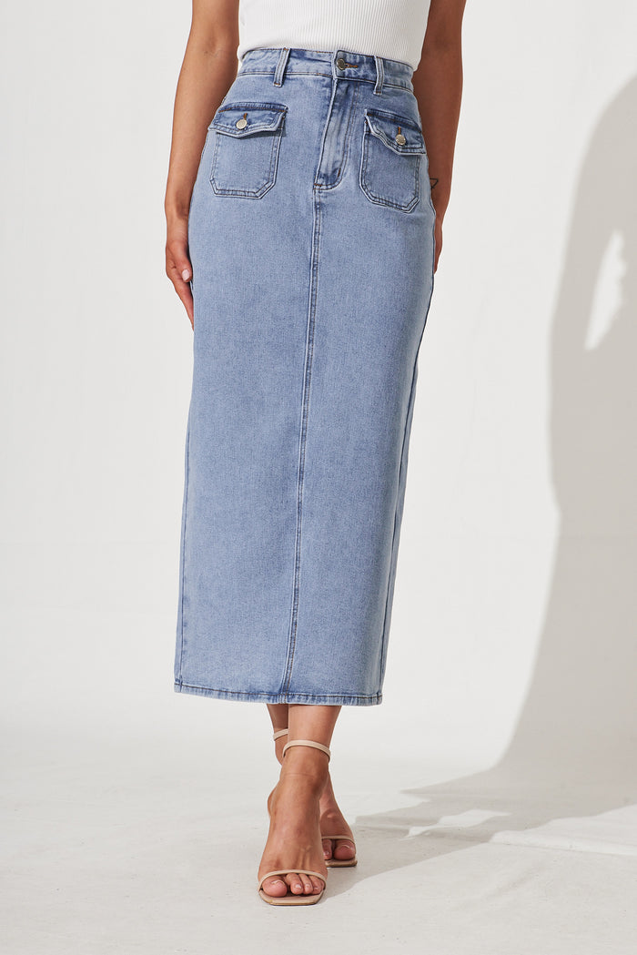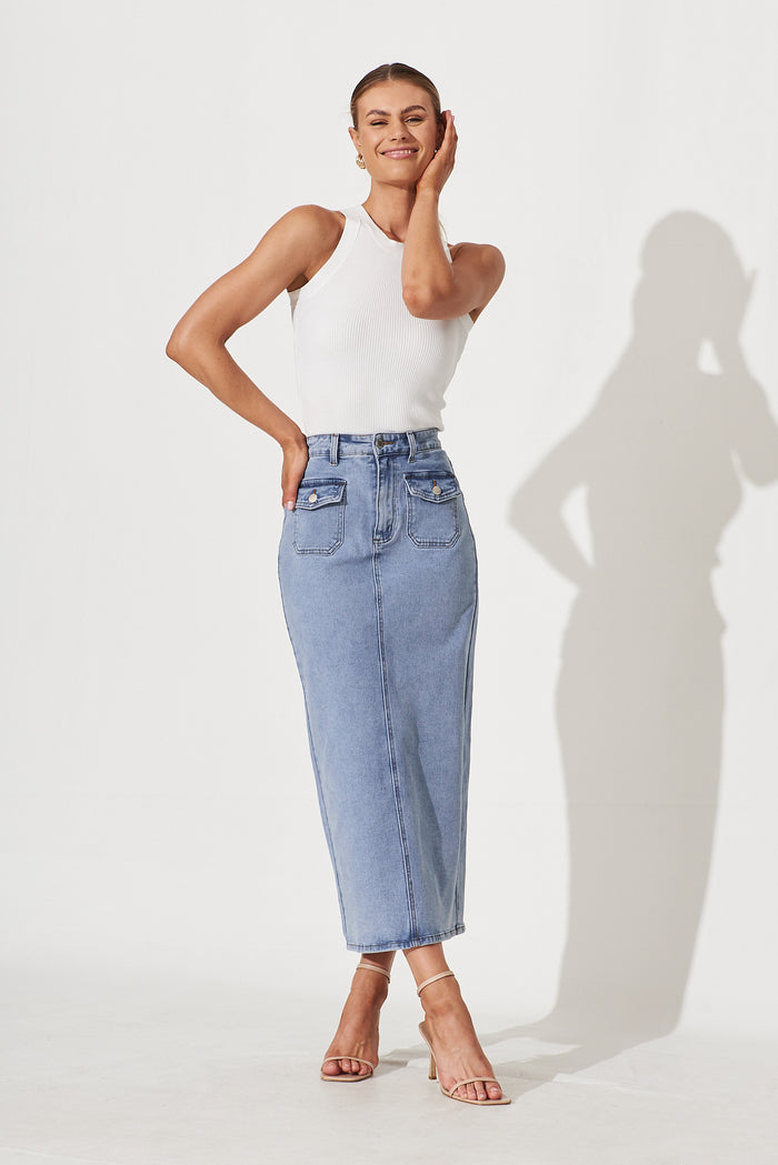 Level up your denim game with our Delta Maxi Denim Skirt! A modern take on a wardrobe staple that can be dressed up or down with ease. For the ultimate off duty outfit, style with a white tee, boyfriend blazer and finished off with a pair of fresh white sneakers!