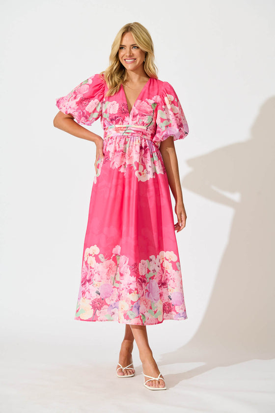 Divine Maxi Dress In Pink With Lilac Multi Floral Print