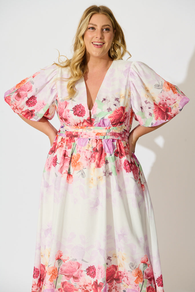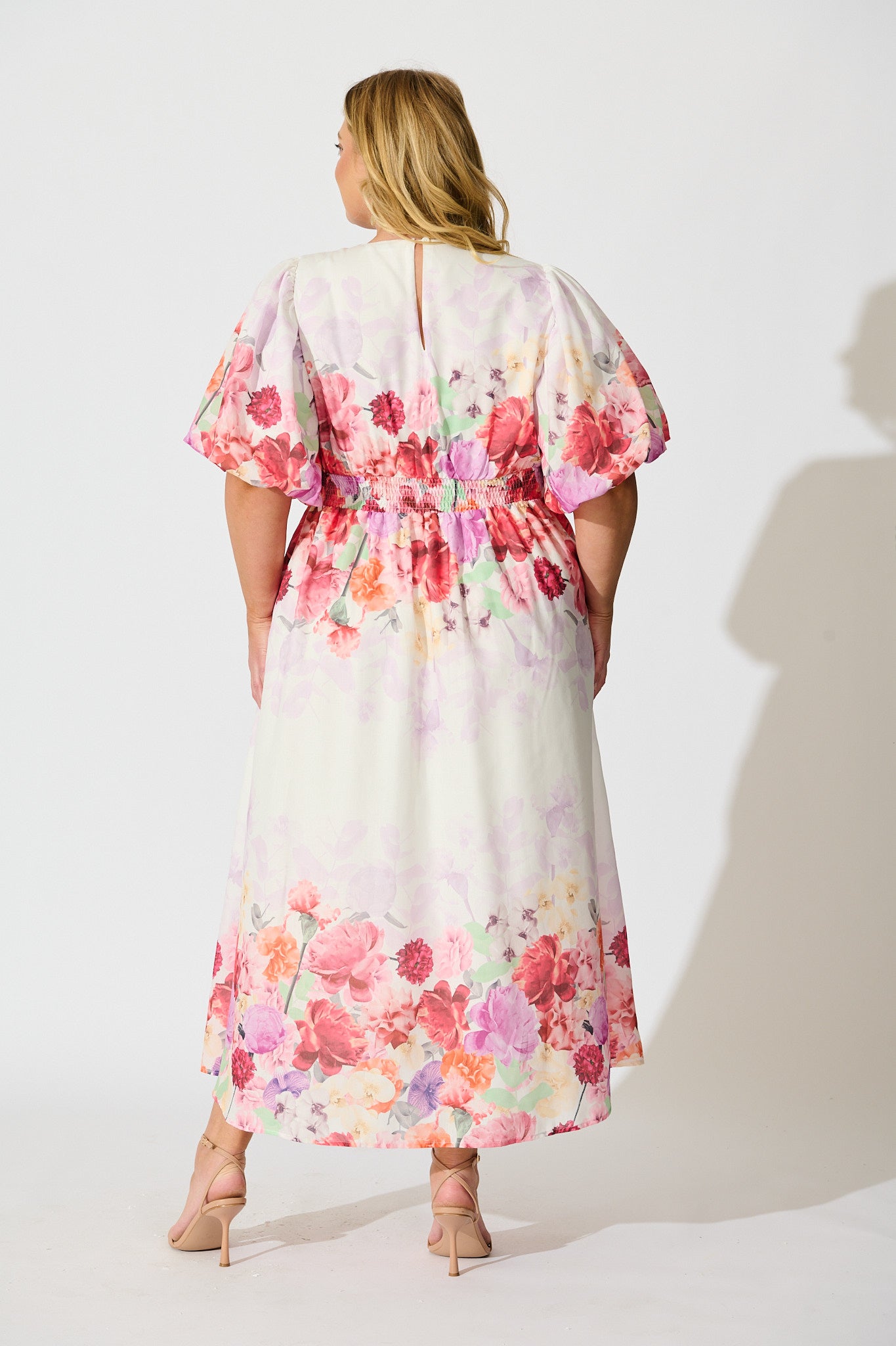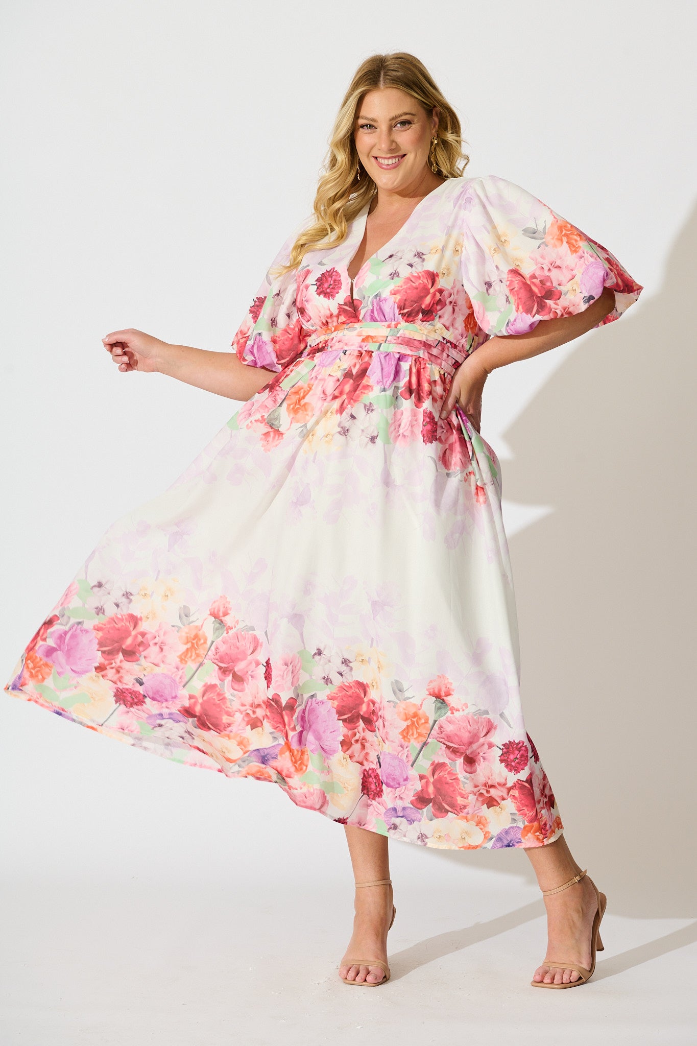 Divine Maxi Dress In White With Pink Multi Floral Print