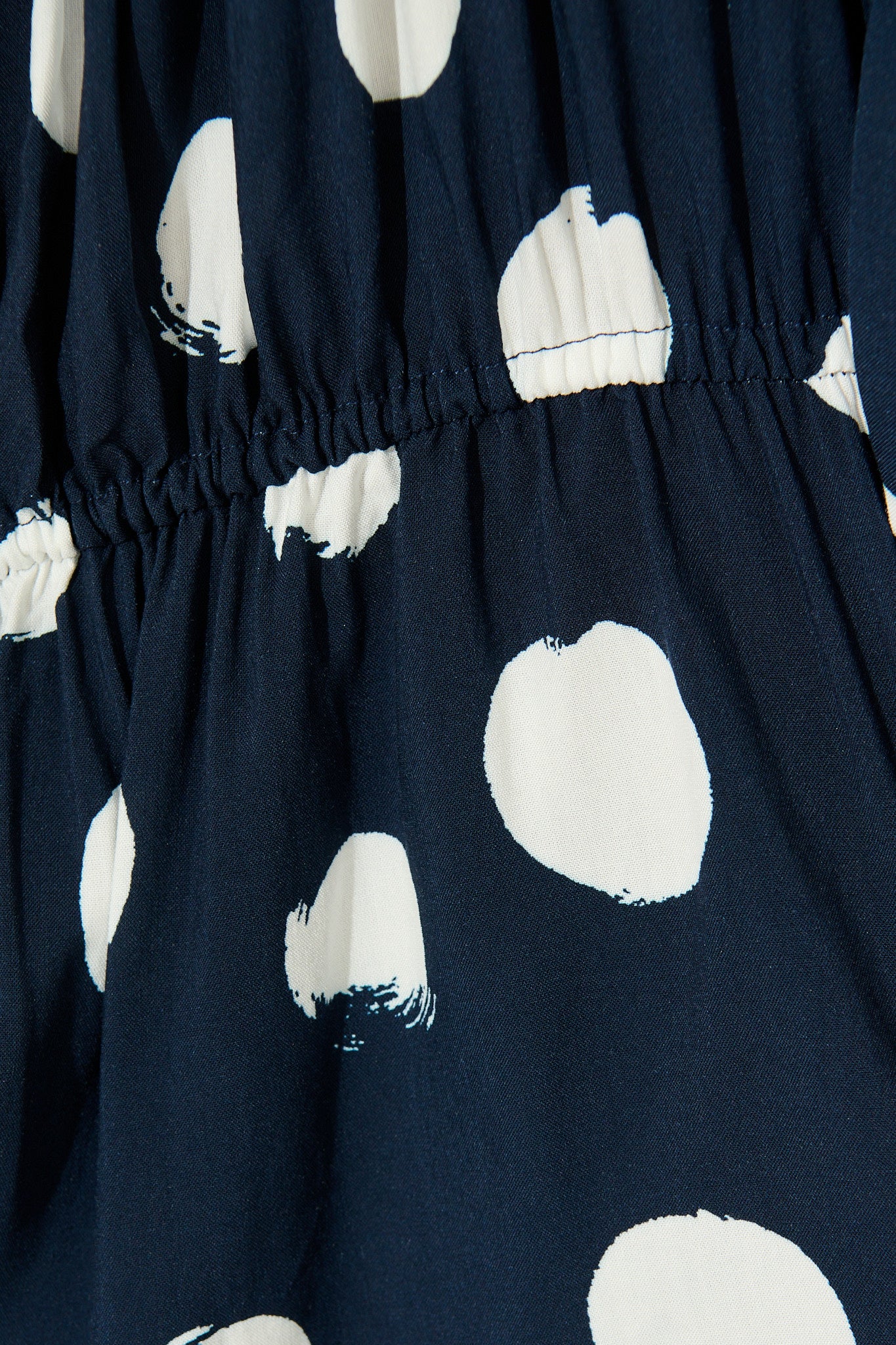Crafted from 100% rayon, it’s designed in a lightweight, breathable fabric that feels soft against the skin and keeps you comfortable all day long. The non-stretch silhouette drapes beautifully over the body, giving you that easy, off-duty elegance we all crave. The classic navy base is peppered with crisp white spots, adding a fresh, playful edge to your look.