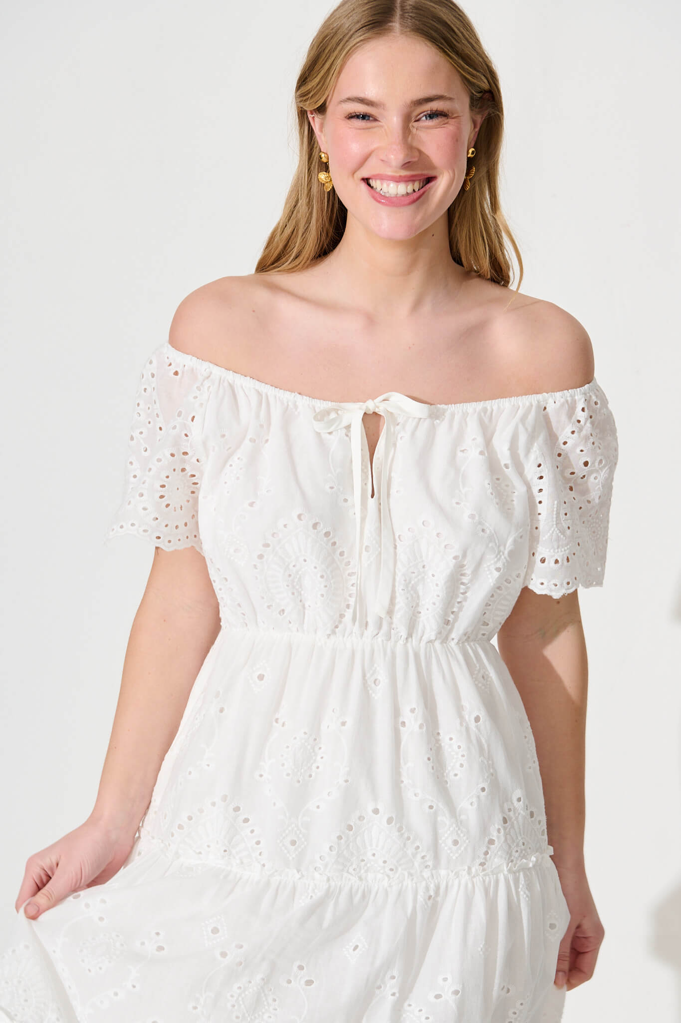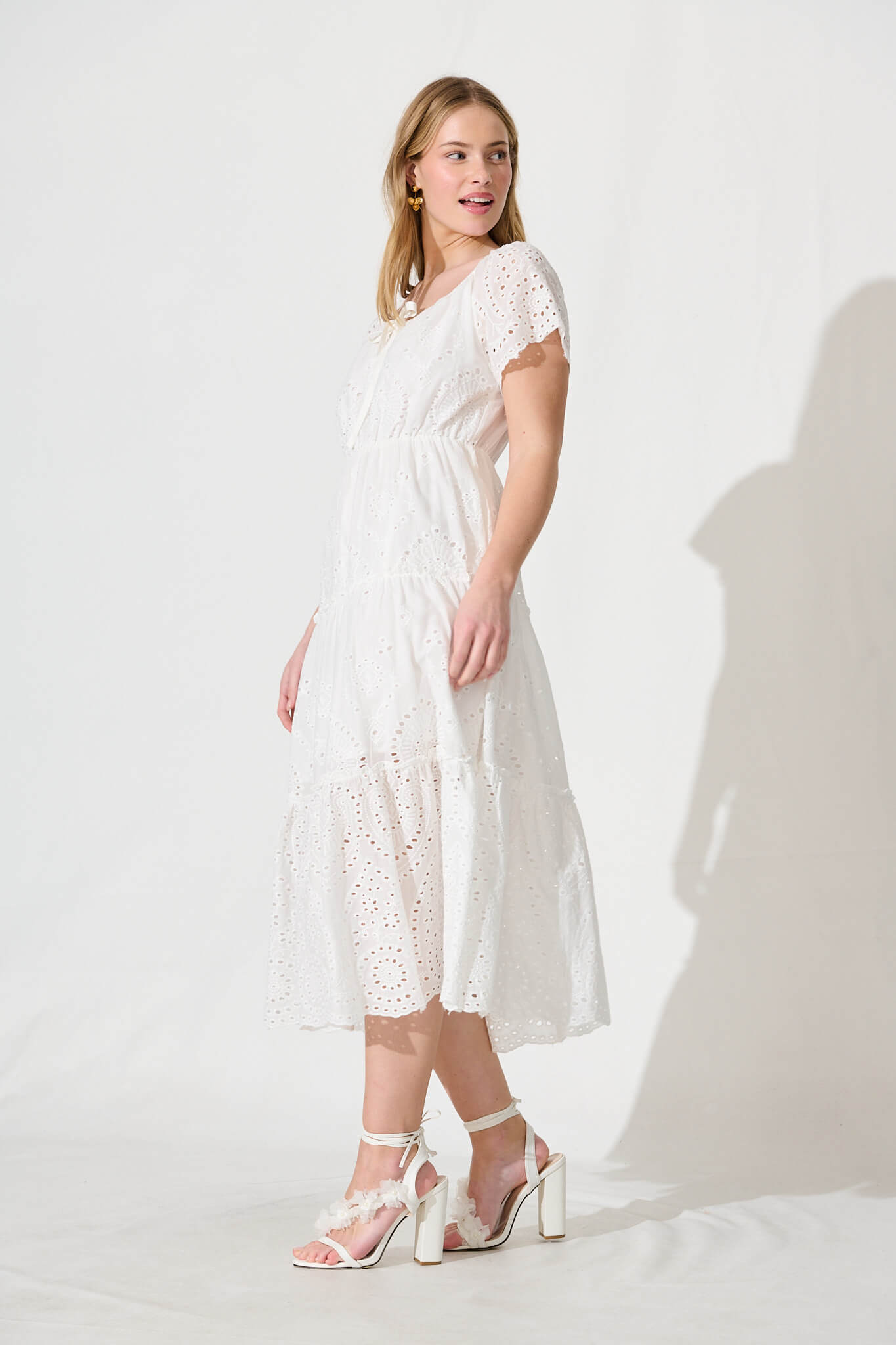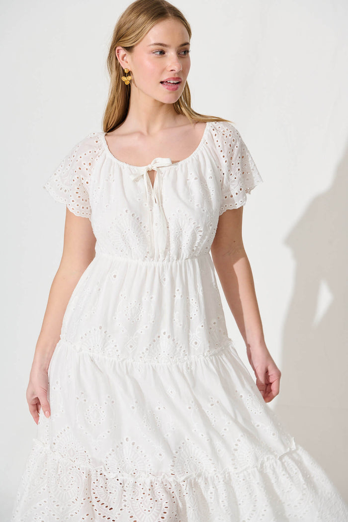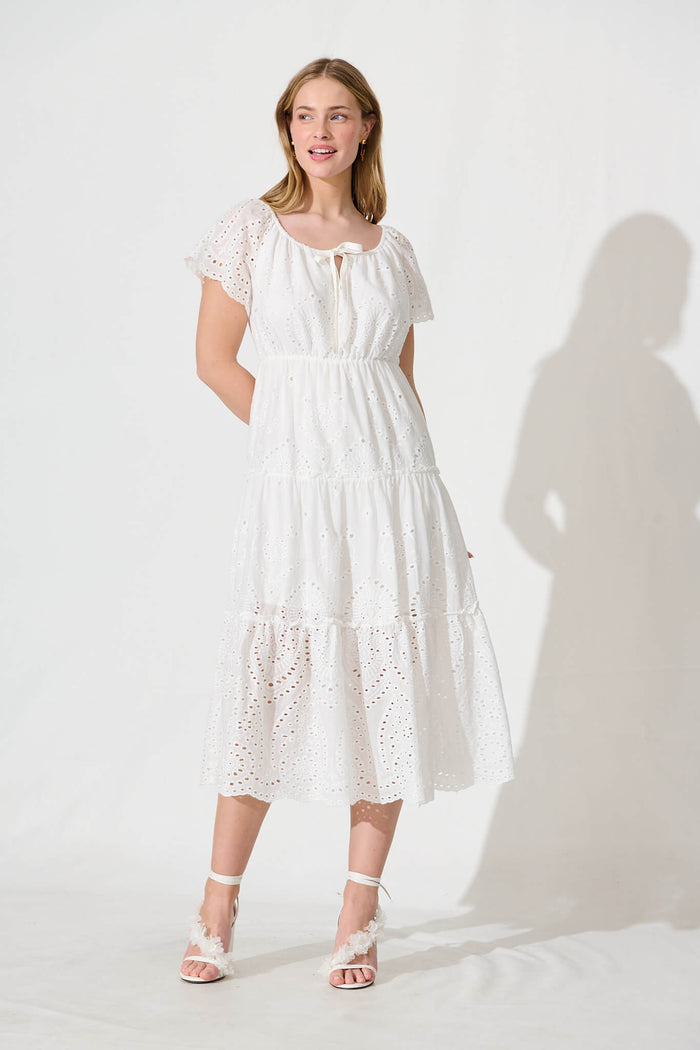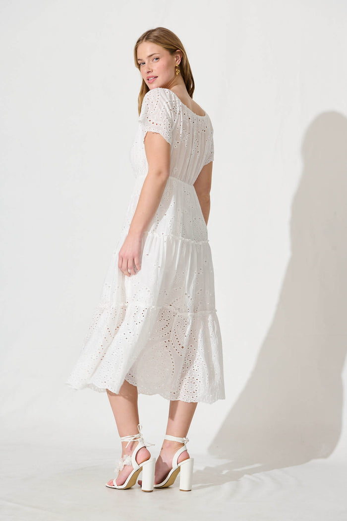 Dovie Midi Dress In White Broderie Cotton