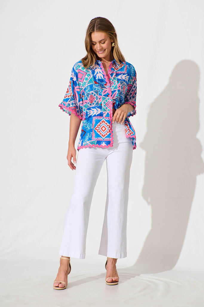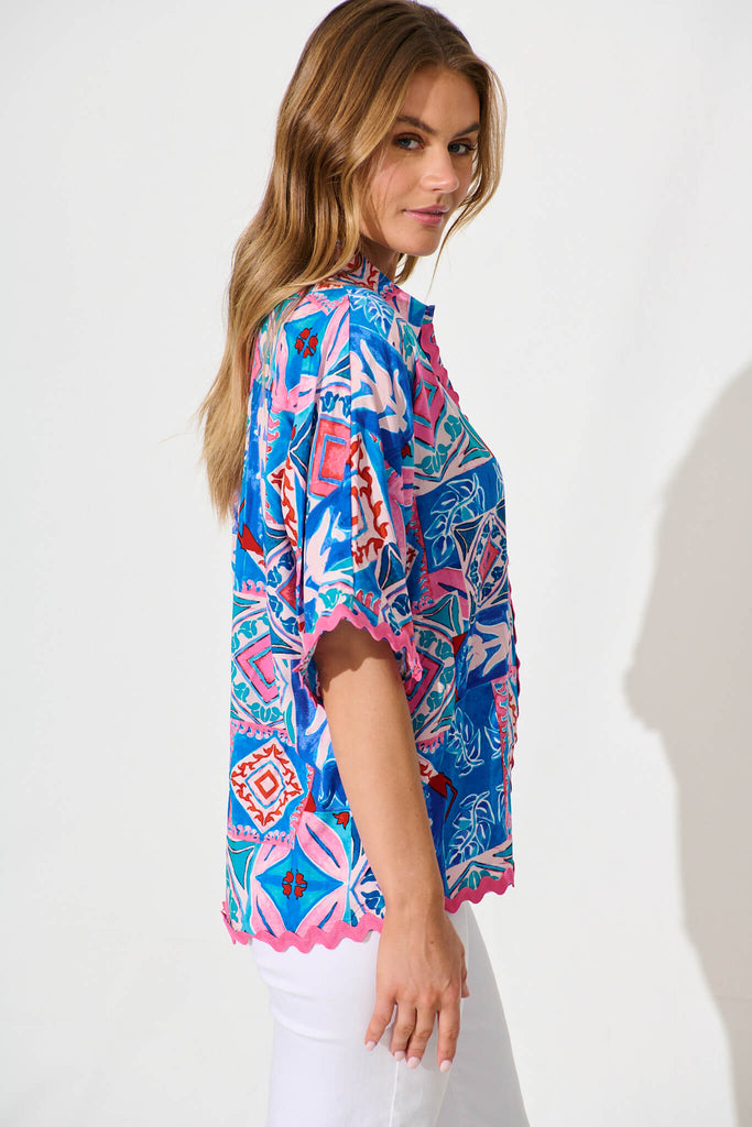 Dream Girl Shirt in Pink and Blue Multi with Ric Rac Trim