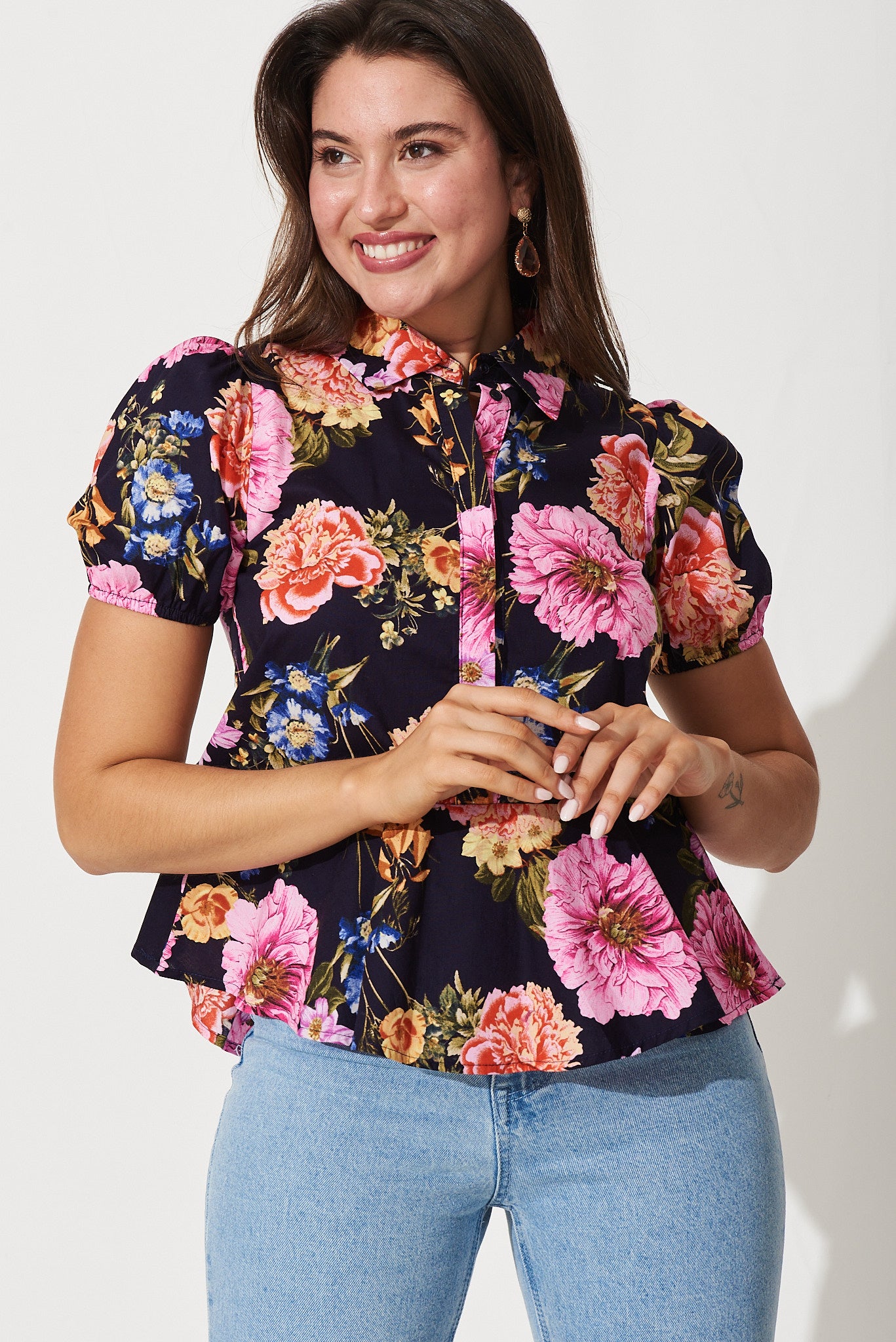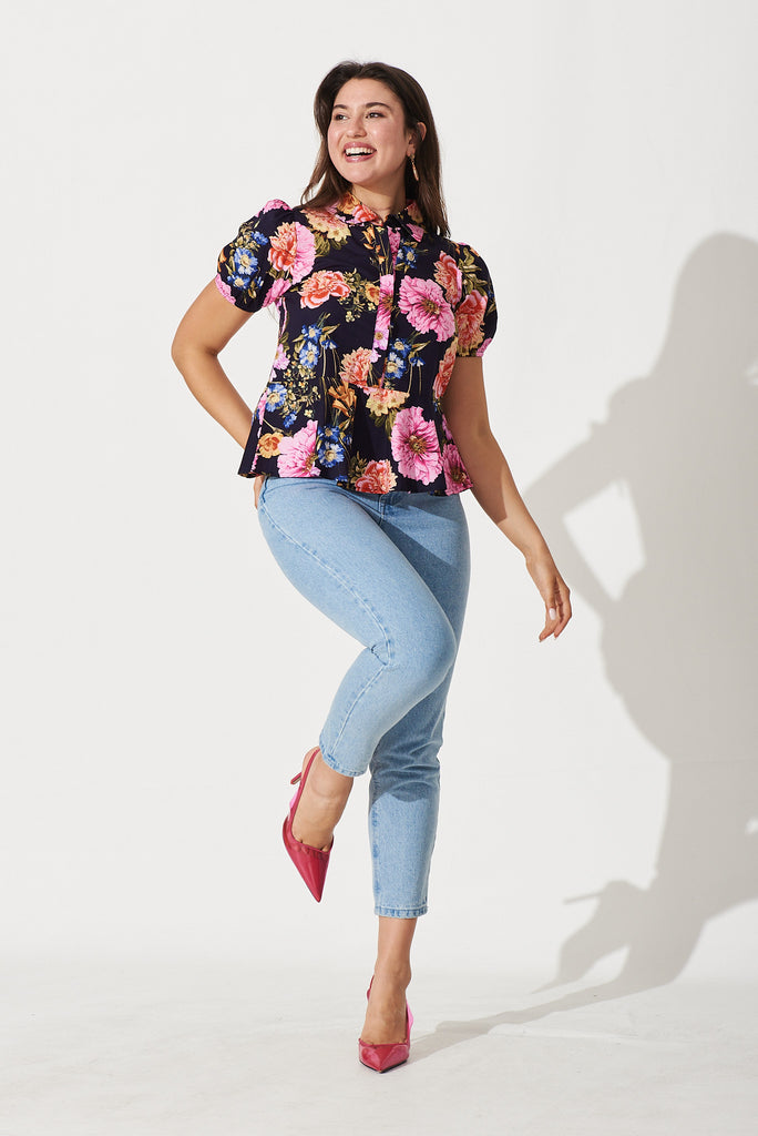 Drew Top In Navy With Pink Multi Floral Cotton