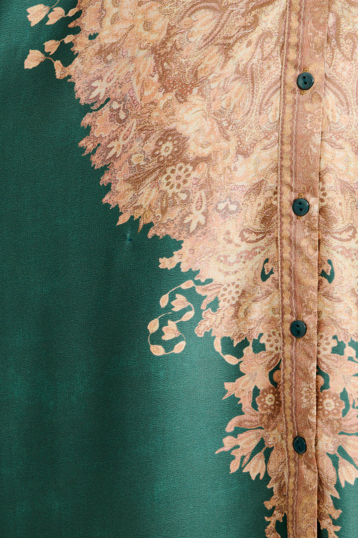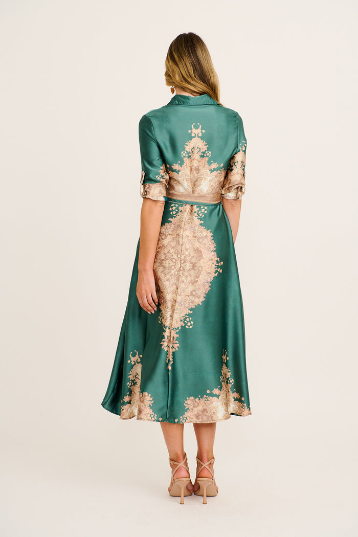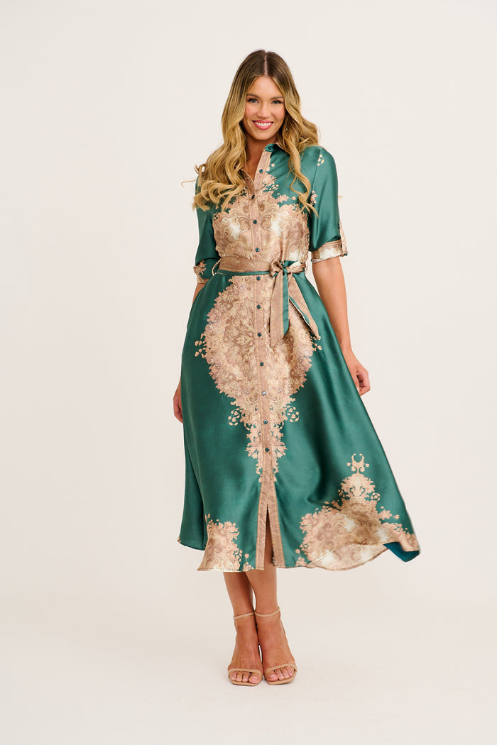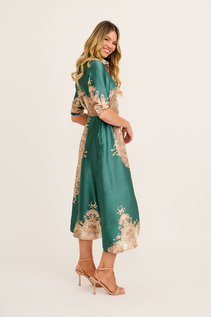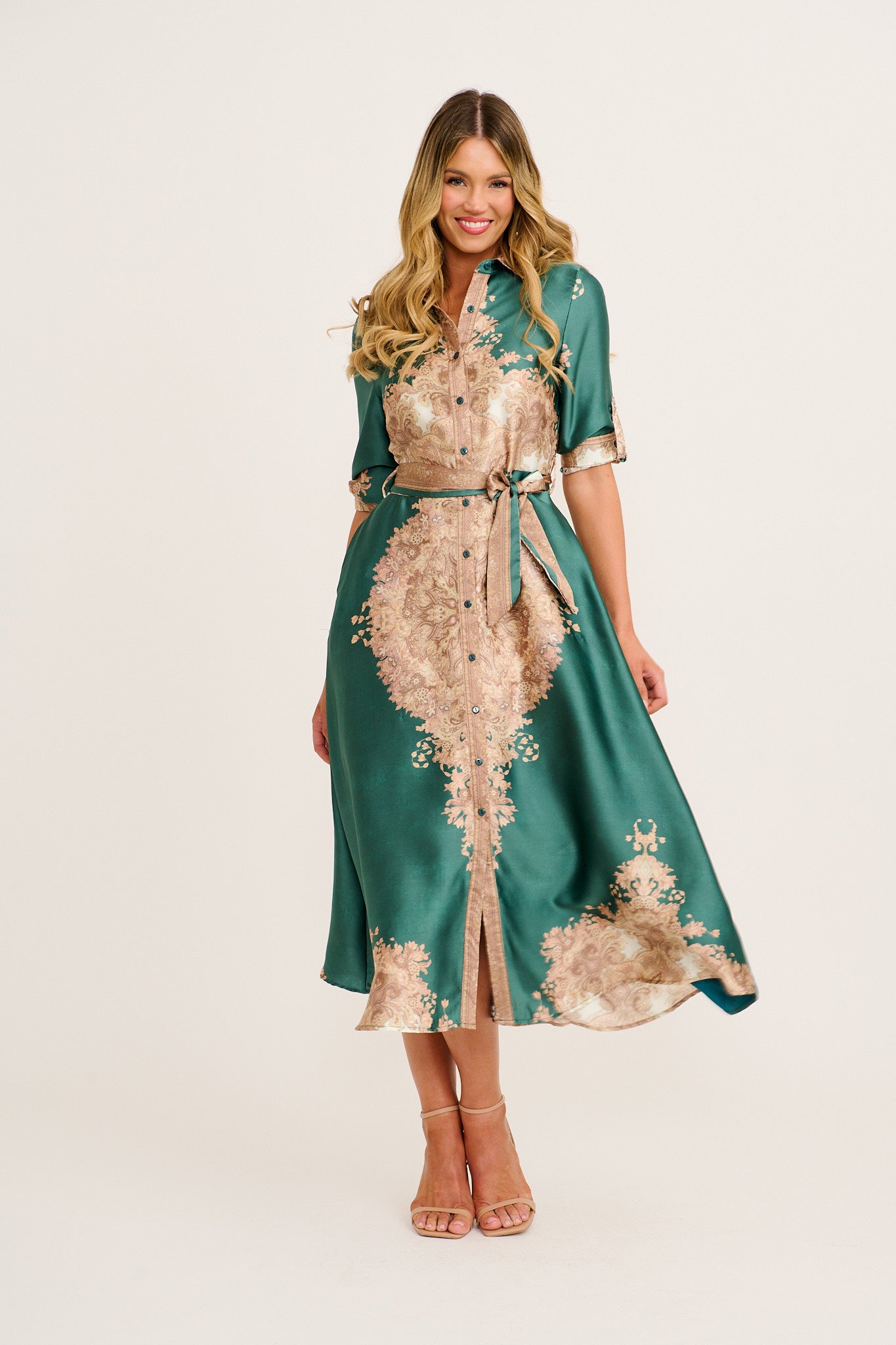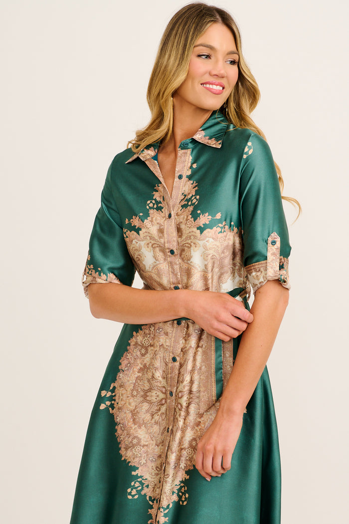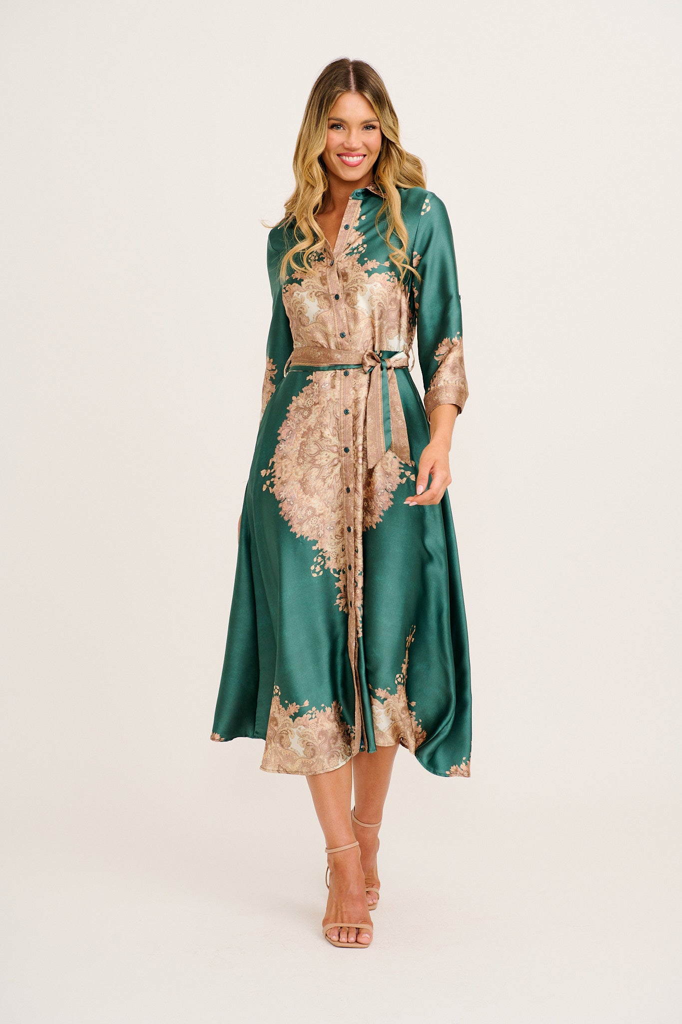 Ellen Midi Shirt Dress in Emerald with Multi Placement Satin