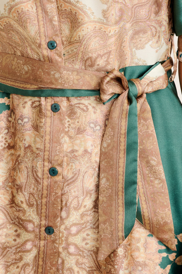 Crafted from a lightweight, non-stretch satin fabric, it drapes beautifully over the body, skimming where it should and cinching in with a separate waist tie for a flattering fit. The emerald green base is highlighted by a vibrant placement print, while the 3/4 rolled sleeves and collared neckline add structure and elegance. Functional buttons run down the front, making it easy to wear and versatile to style.