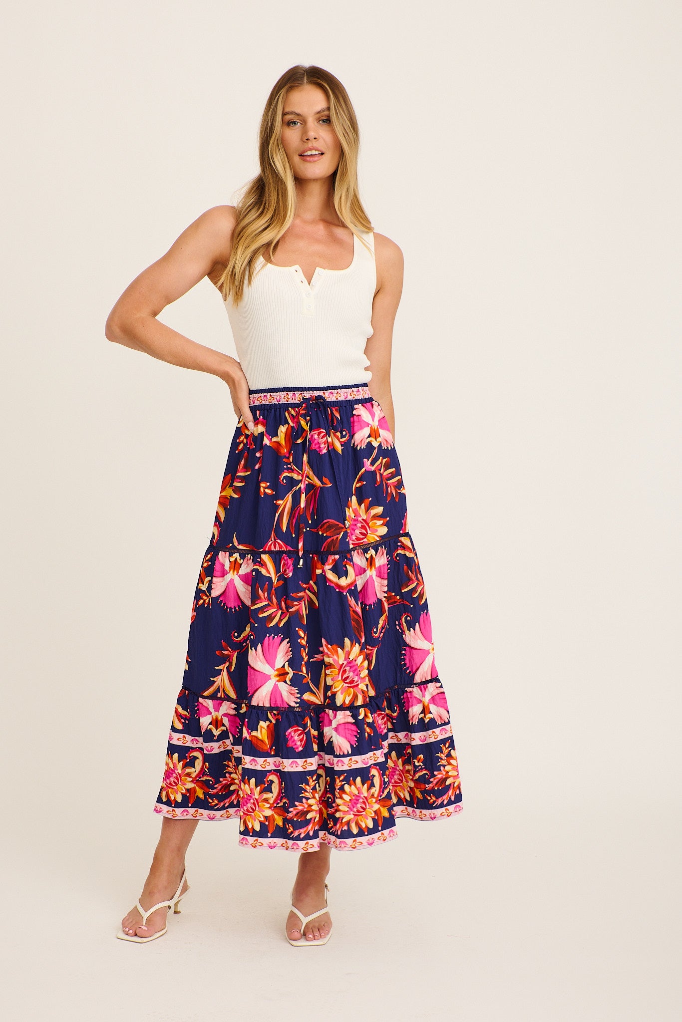 The Elris Maxi Skirt in Navy with Pink Floral Linen Blend delivers effortless movement and style. With its soft drape and romantic floral print, it's the perfect throw-on piece for warm days, weekends away, or dressed-down moments with charm.