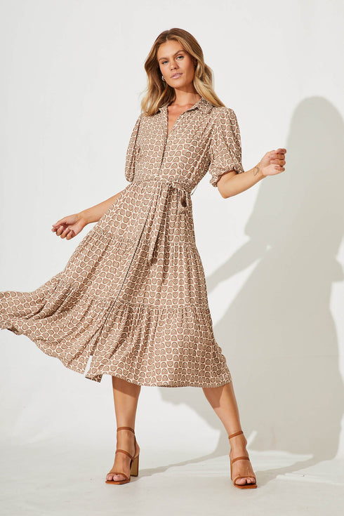 Emmadale Midi Shirt Dress In Tan And Cream Geometric Print