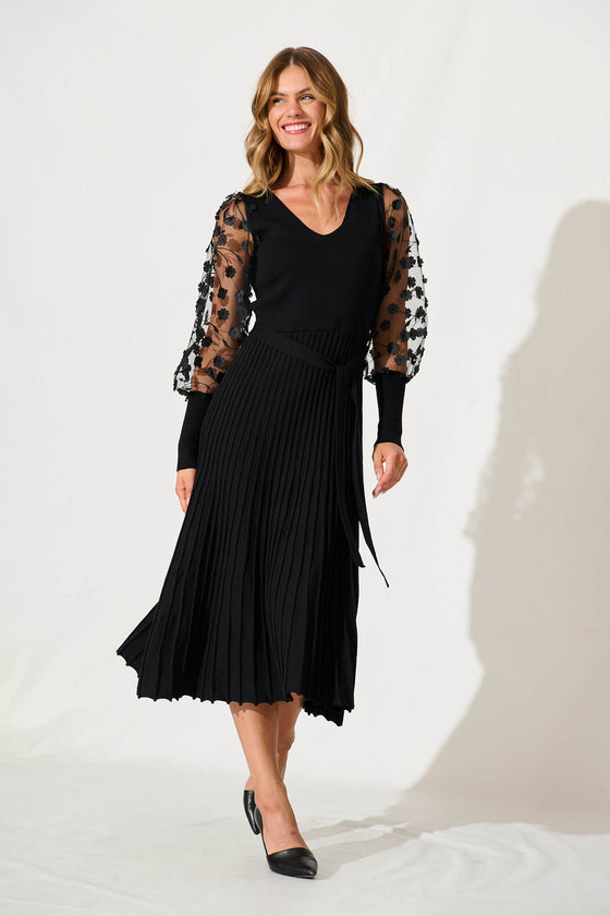 Enchanted Midi Knit Dress In Black With Mesh Flower Detail