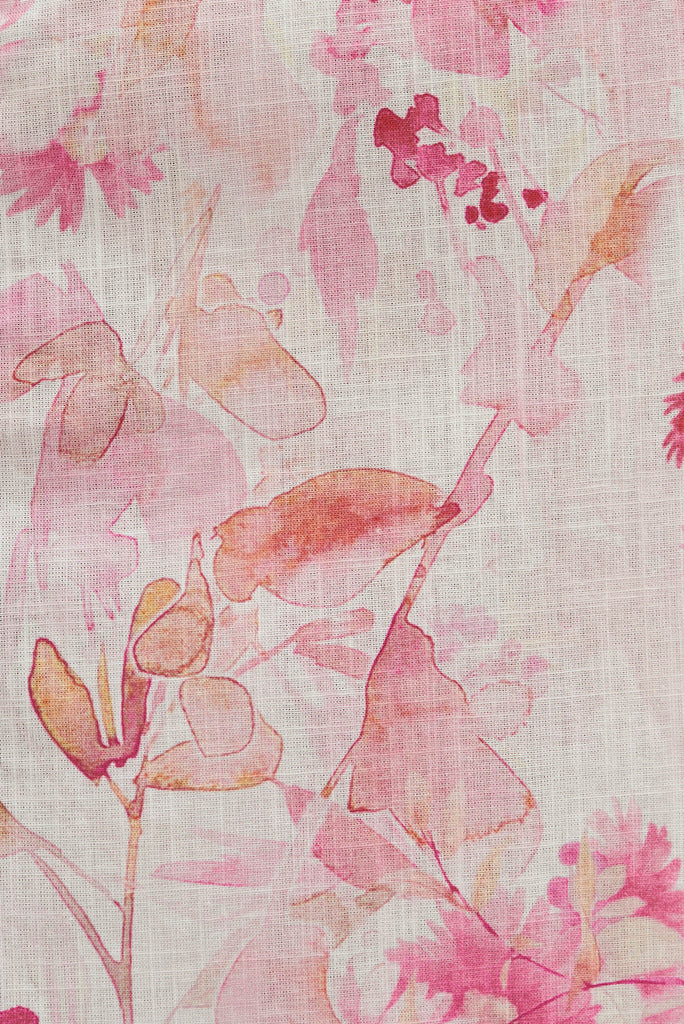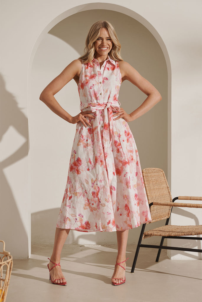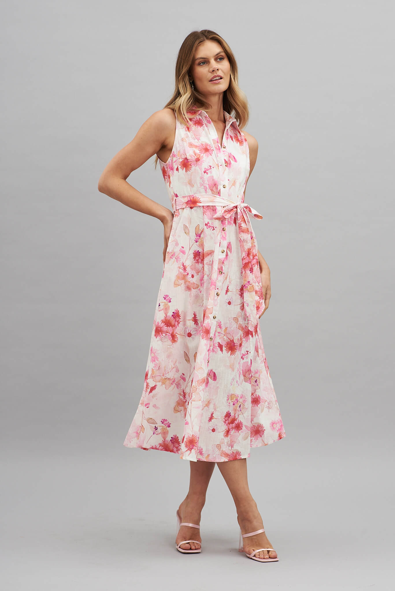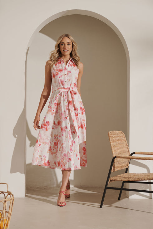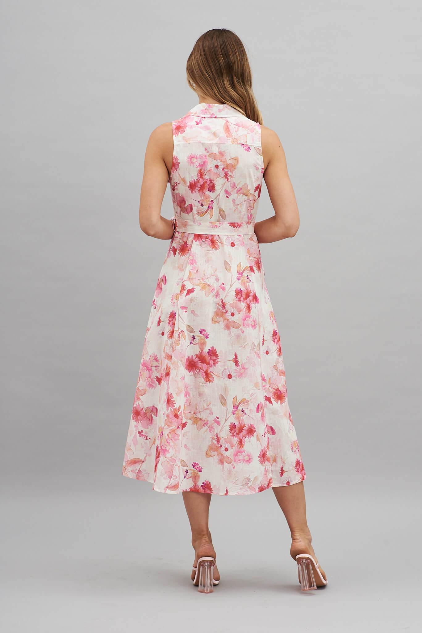 Epic Midi Shirt Dress In White With Pink Floral Print Cotton Linen
