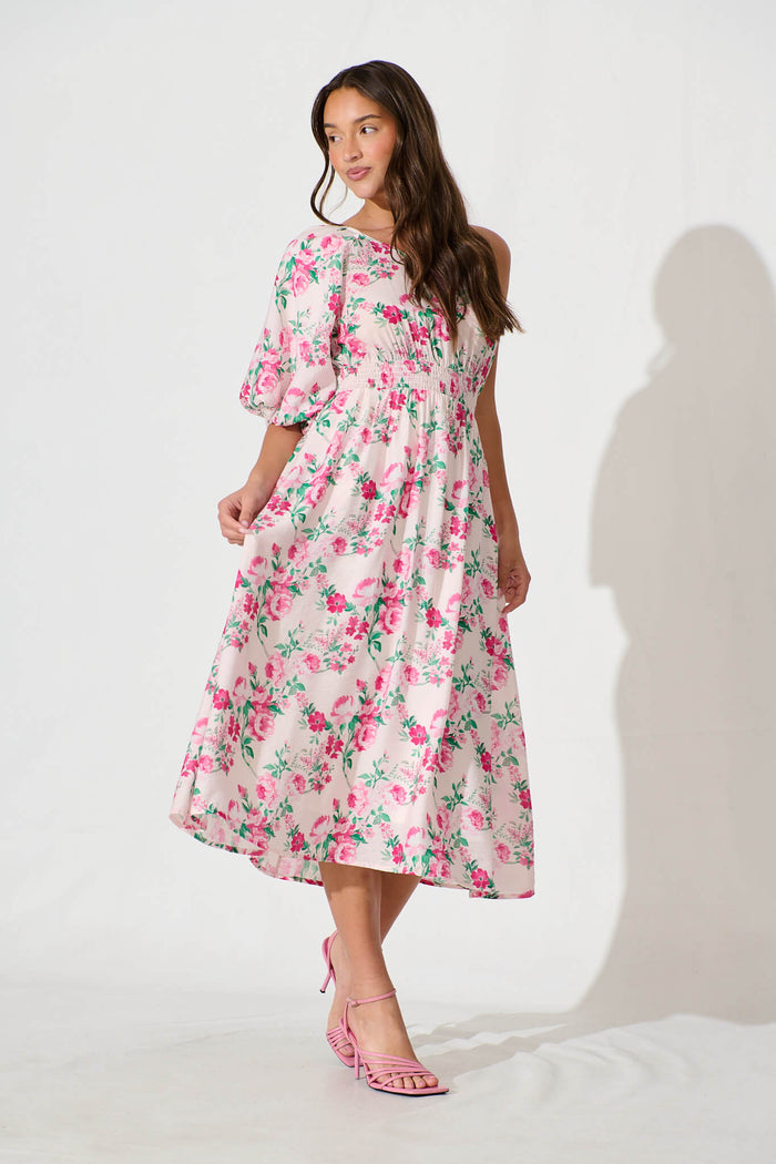Esen Midi Dress in Pink and Green Floral Cotton Blend