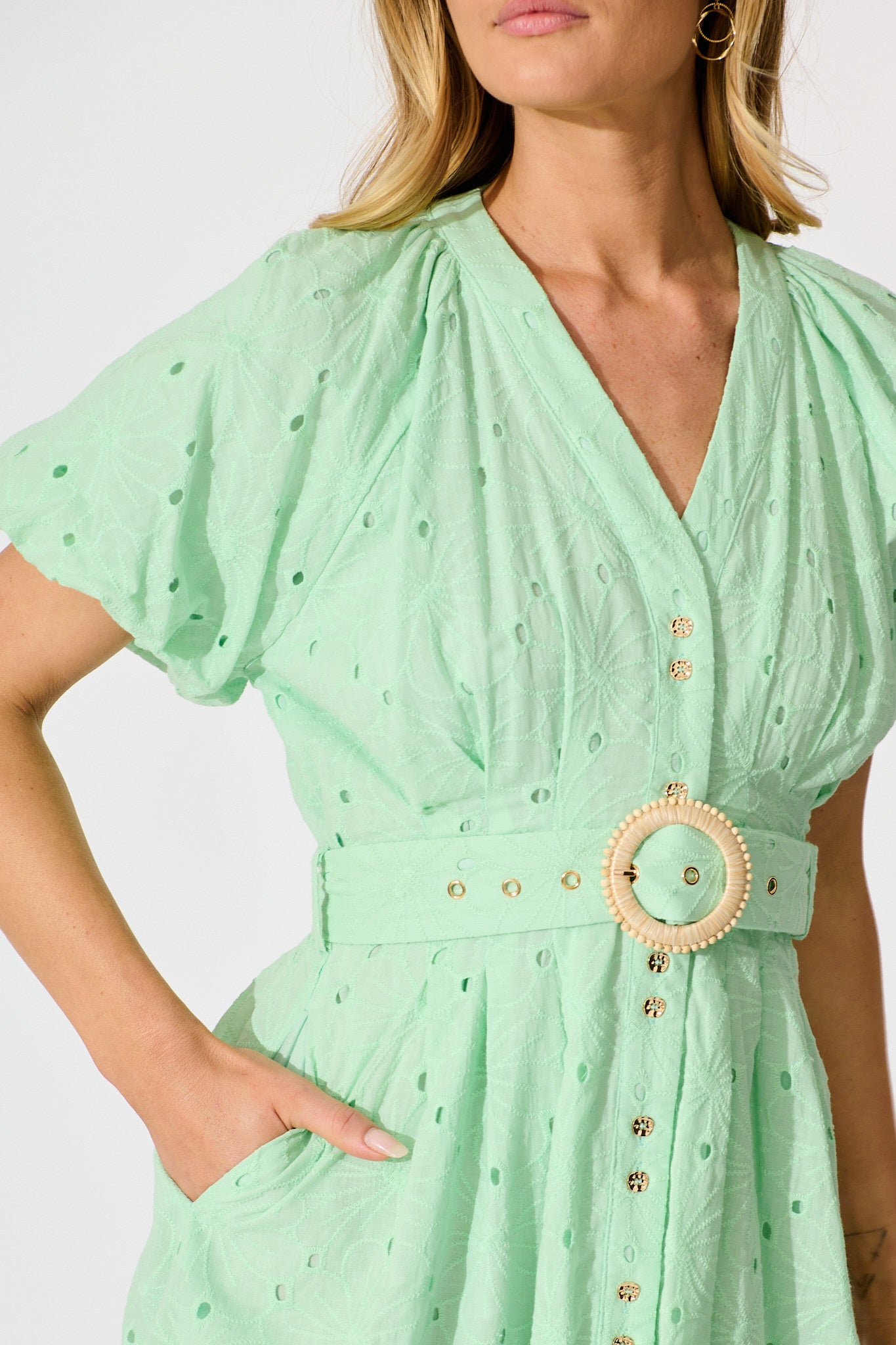 The Eugena Dress in Mint Broderie Cotton merges pastel grace with artisan texture. Soft mint tones underscore the broderie pattern, offering a serene mood that suits brunches or garden soirées perfectly.