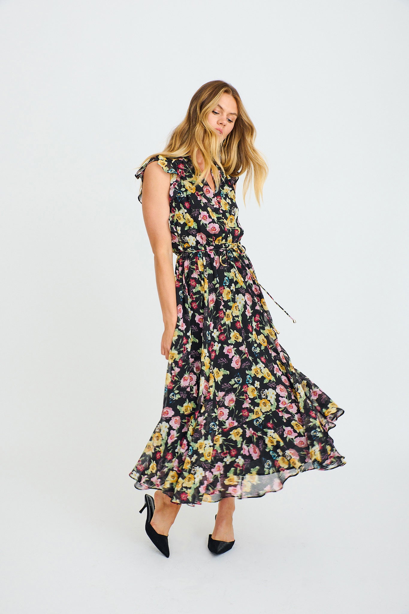 Executive Ease Maxi Dress in Black with Multi Floral Chiffon