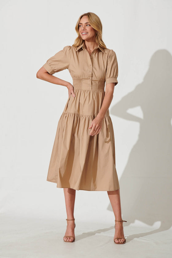 Fairfax Midi Shirt Dress In Taupe Cotton