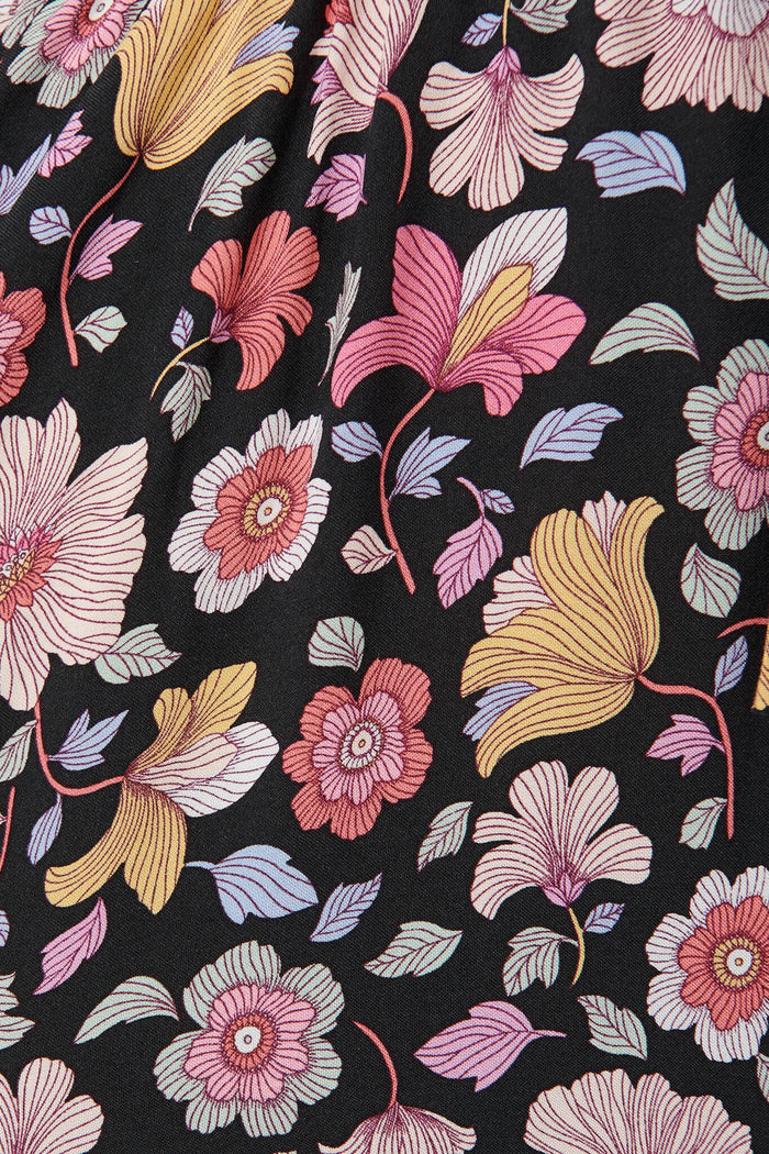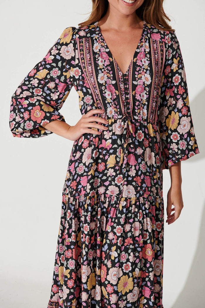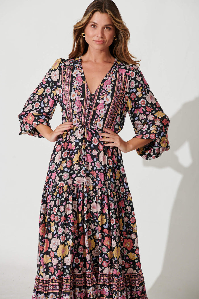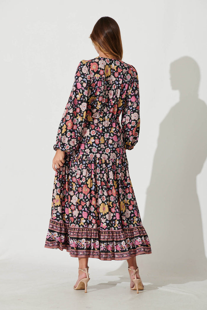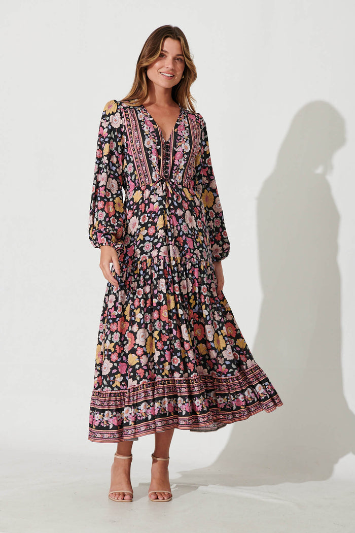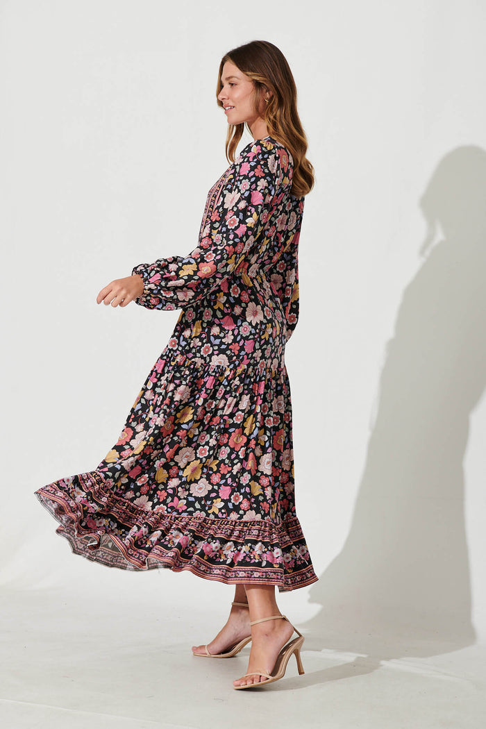 Financier Maxi Dress In Black With Pink Boho Floral