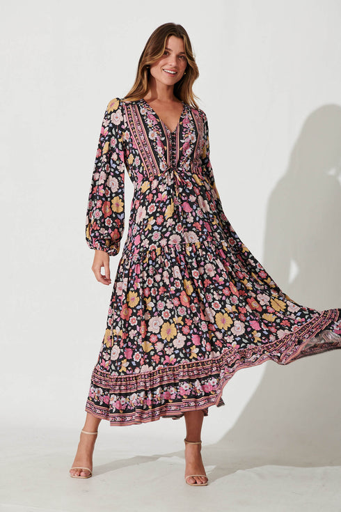Financier Maxi Dress In Black With Pink Boho Floral