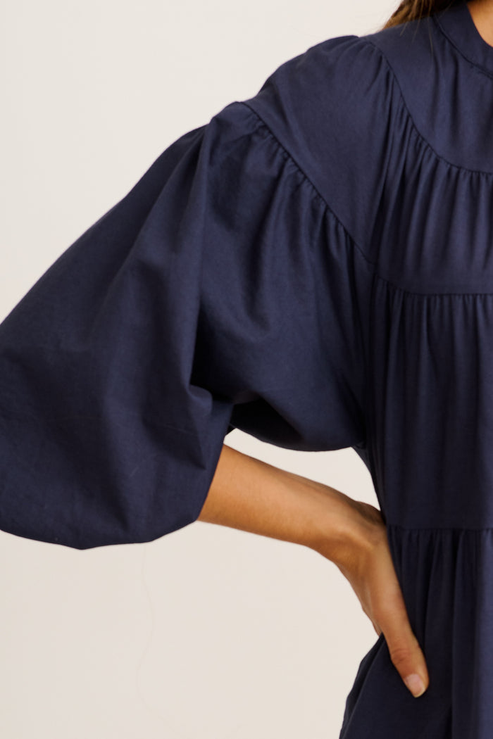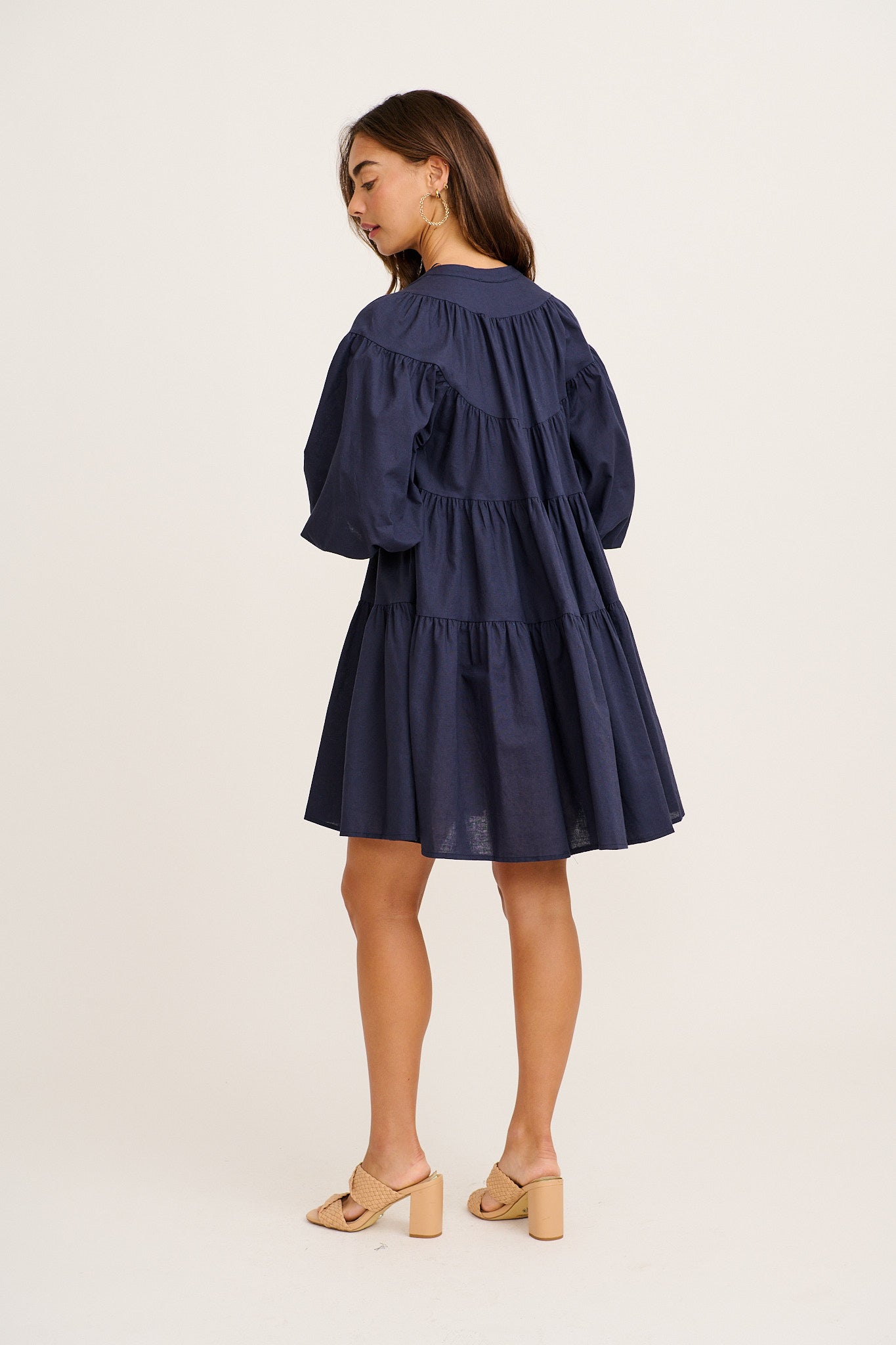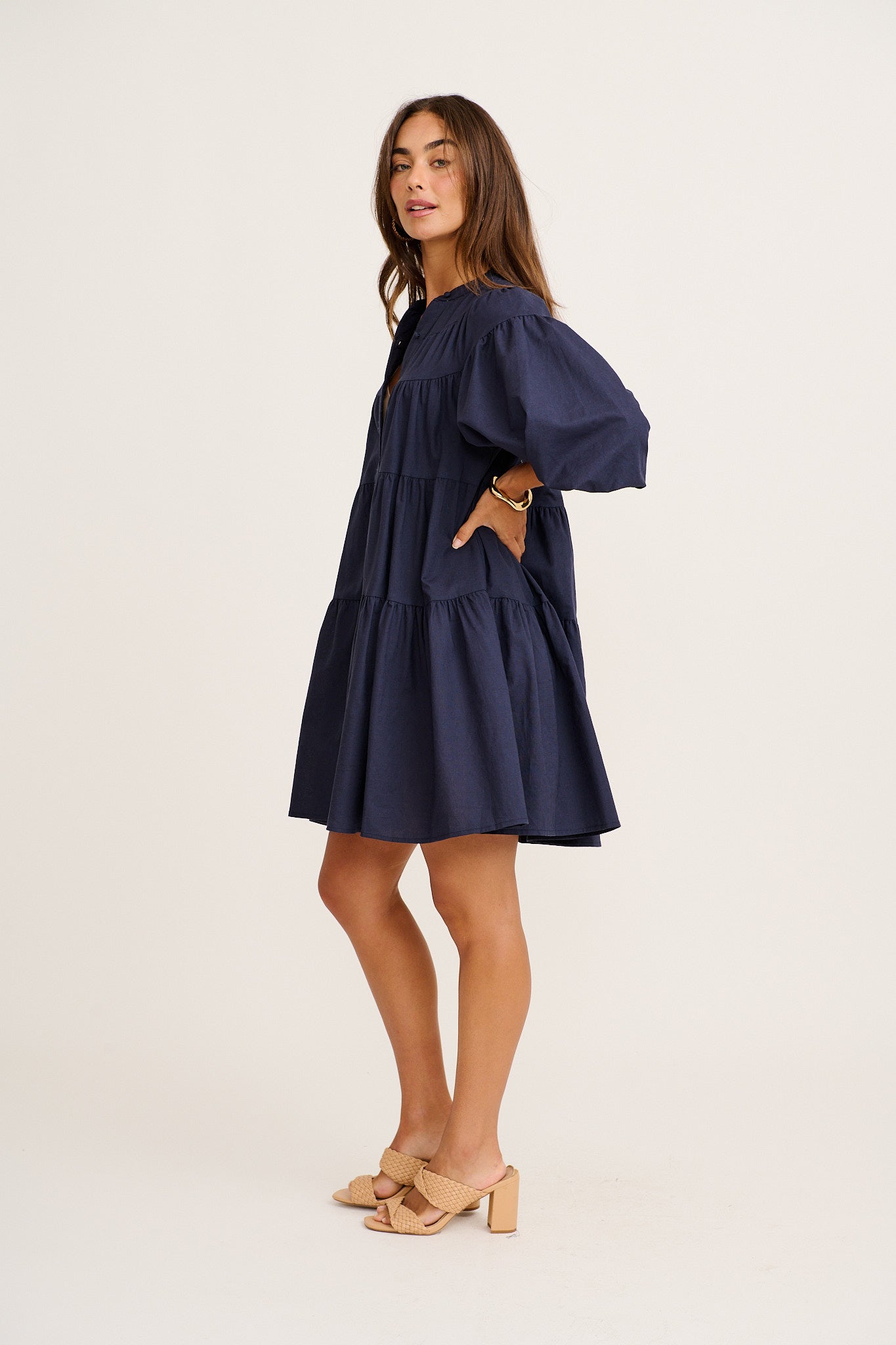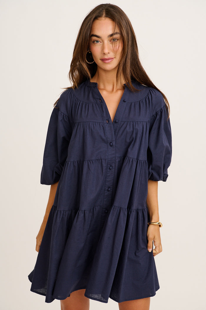 A mandarin collar and functional button-down front lend a subtle structured touch, while the tiered skirt enhances movement and flow. Finished with 3/4 sleeves and encased elasticised cuffs, this above-the-knee style blends comfort with understated polish for versatile wear.