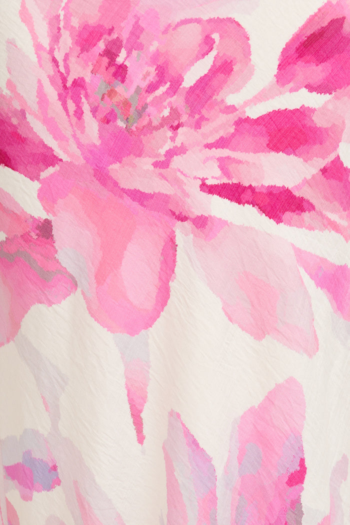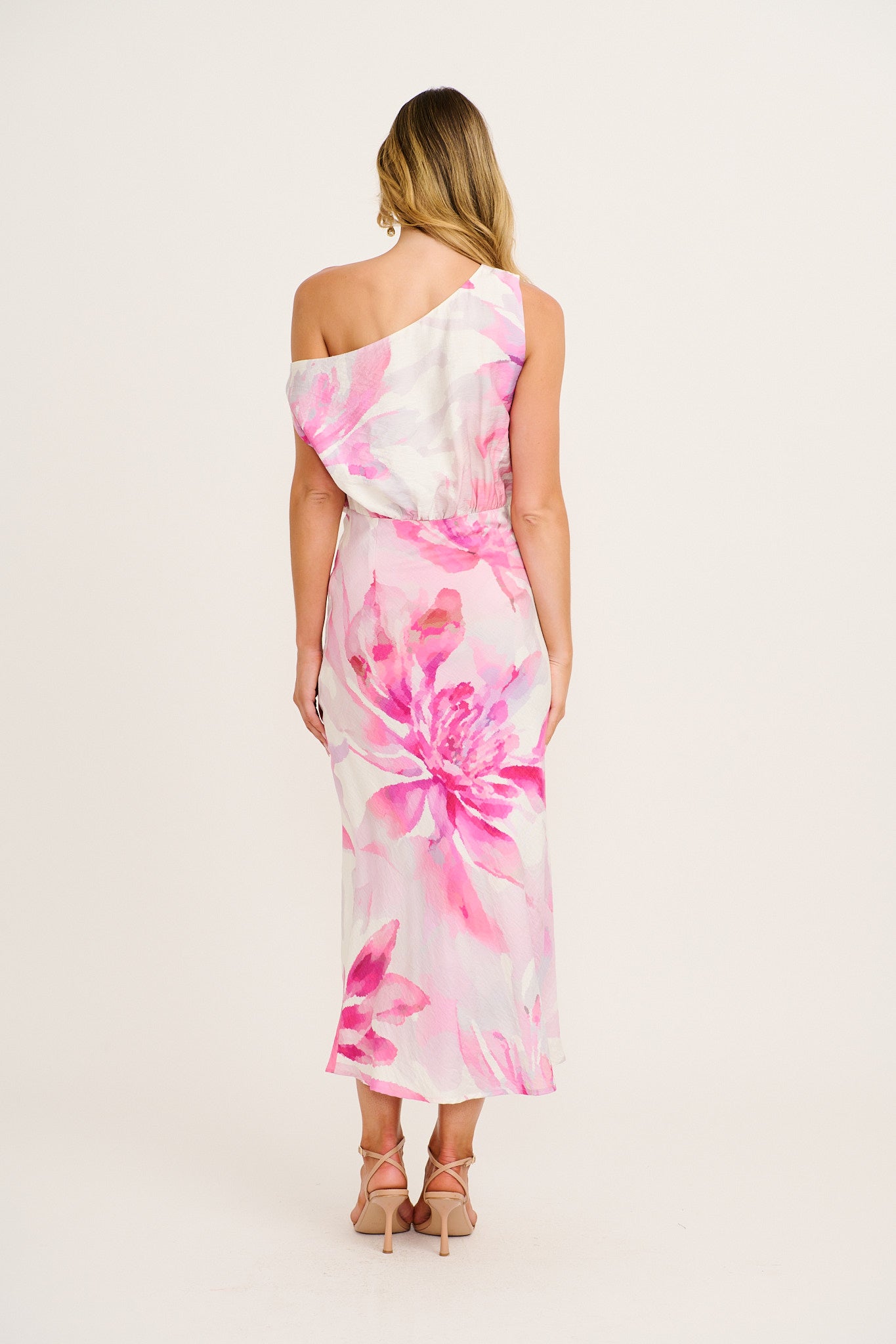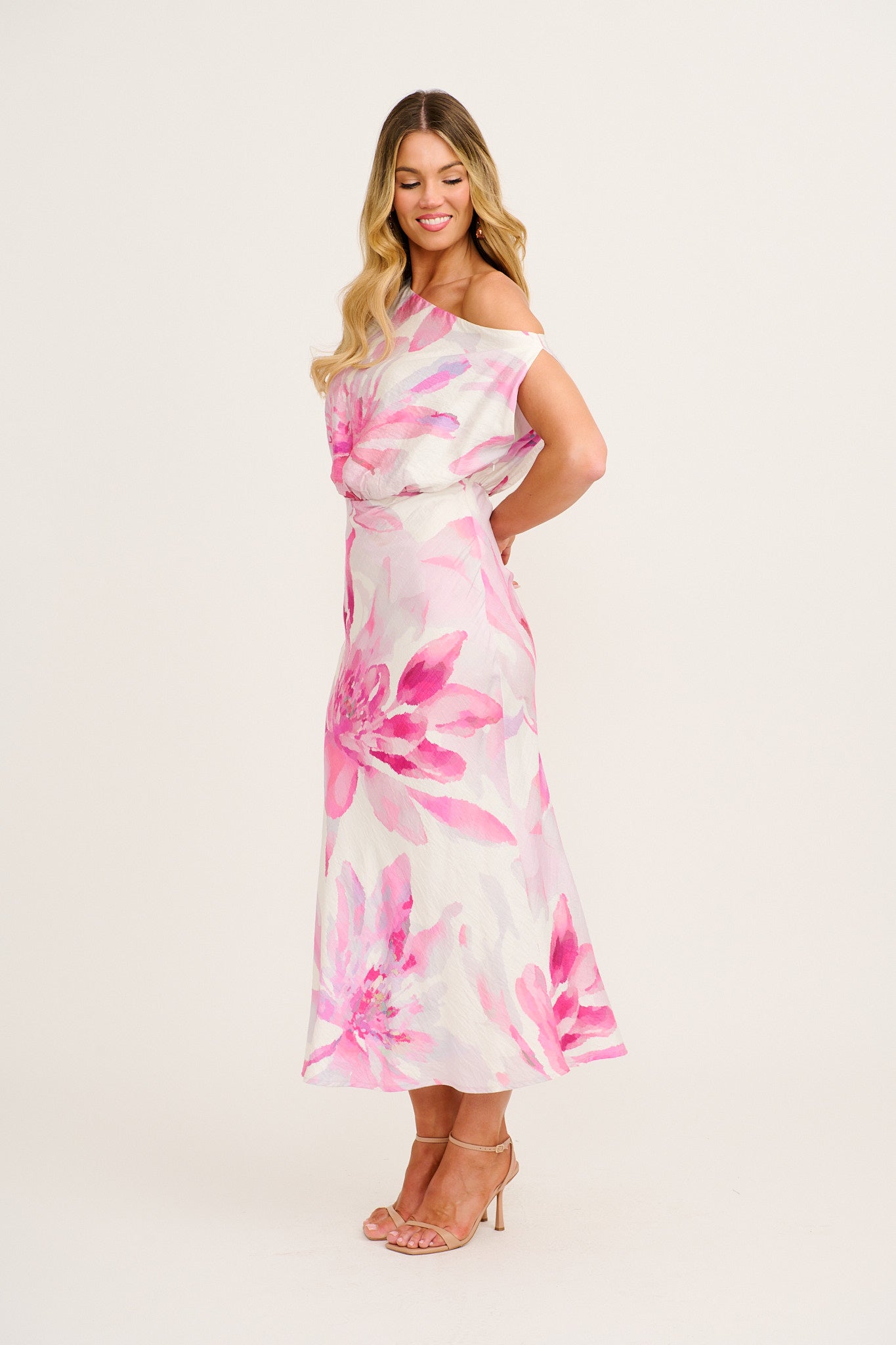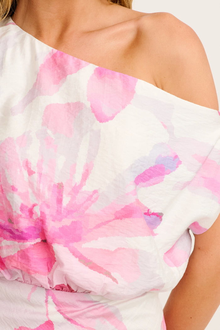 Crafted from lightweight, breathable Wash & Wear viscose blend, this fully lined dress features an asymmetric one‑shoulder silhouette with a fixed waist to flatter your figure. The soft white base and pink floral print create a fresh and vibrant look, while the invisible side zipper ensures a seamless fit. The floaty A‑line shape brings effortless movement as you walk into any occasion with confidence.