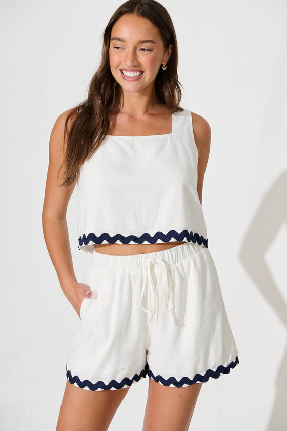 Fontaine Short in White Linen Blend with Navy Ric Rac Trim