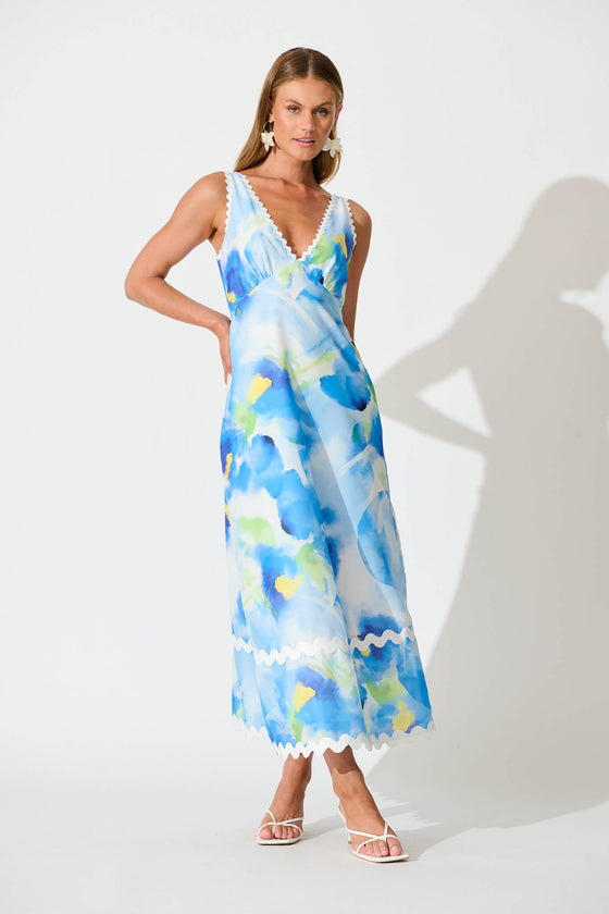 Franca Maxi Dress In Blue Watercolour with Ric Rac Trim