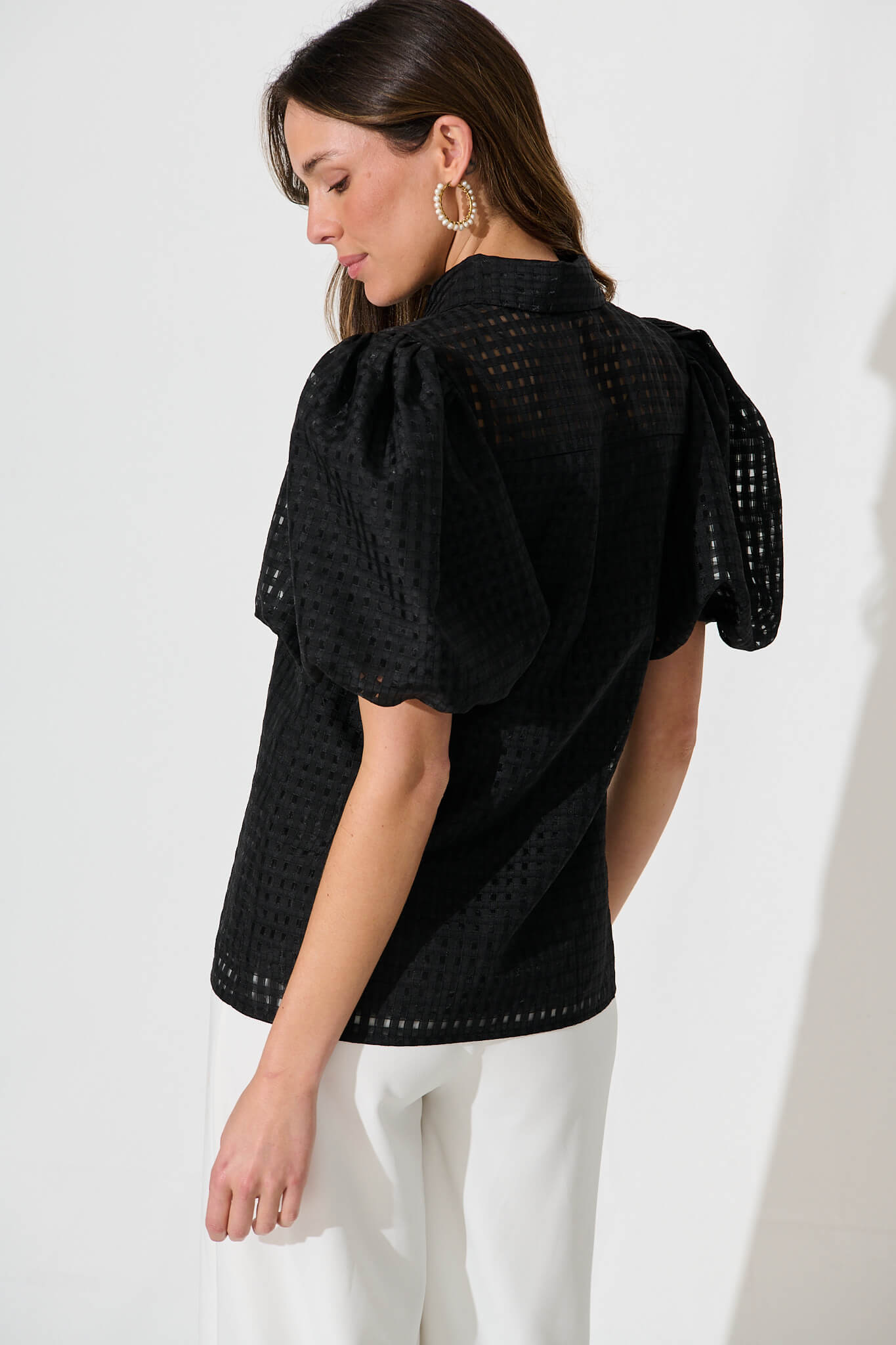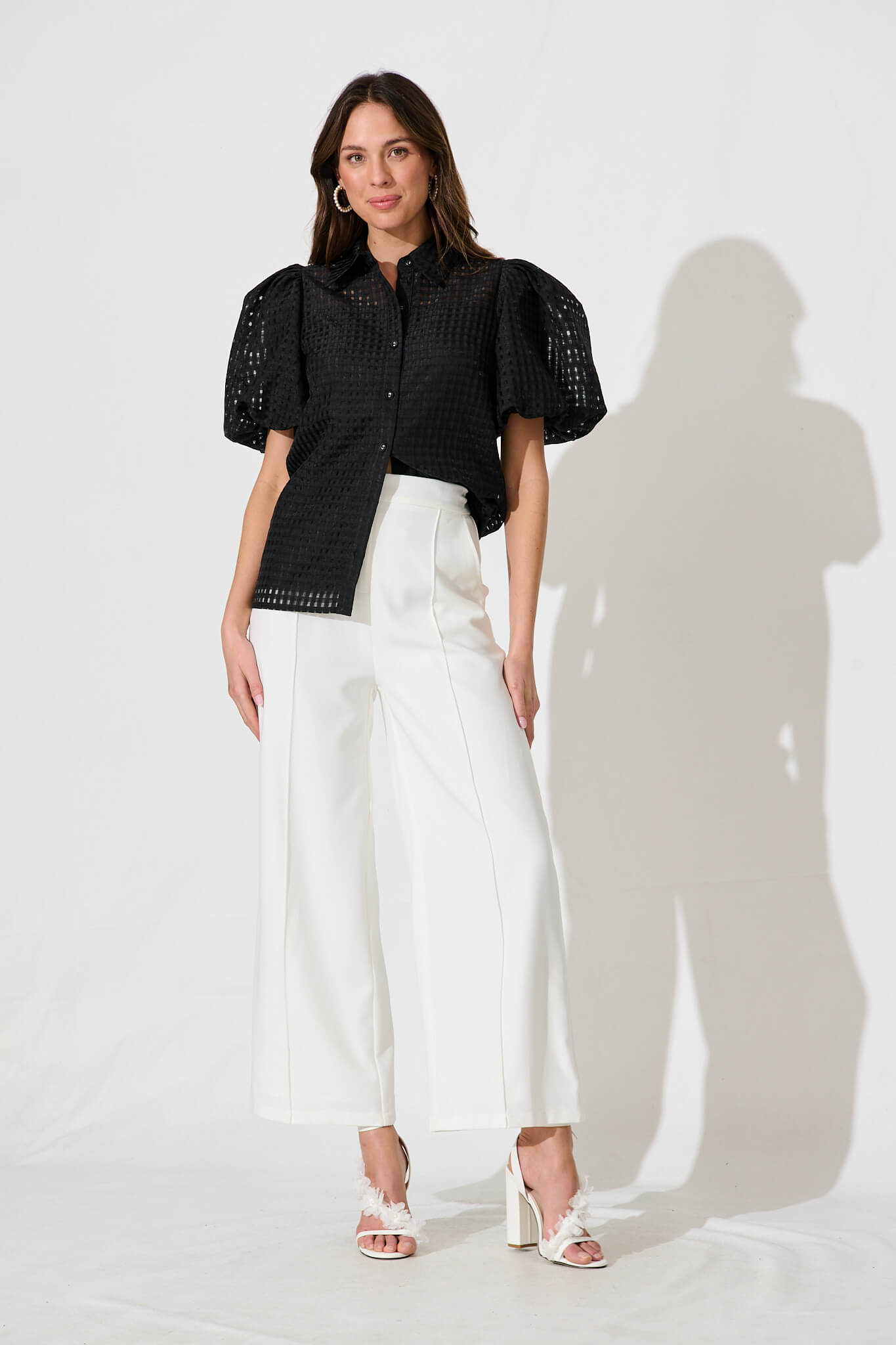 Elevate the game in our Francesca Shirt this season. Made from a semi-sheer fabrication, this blouse sports elegant puffy sleeves with a button front opening and sheer yoke line. Team with your palazzo pants and strappy heels for a chic look.