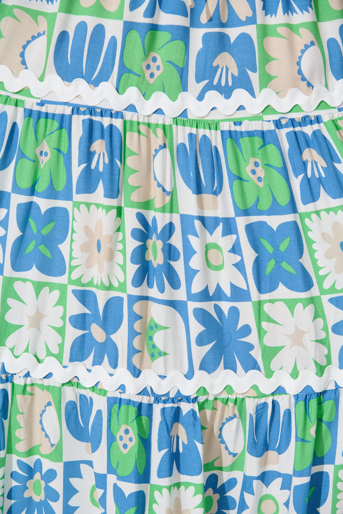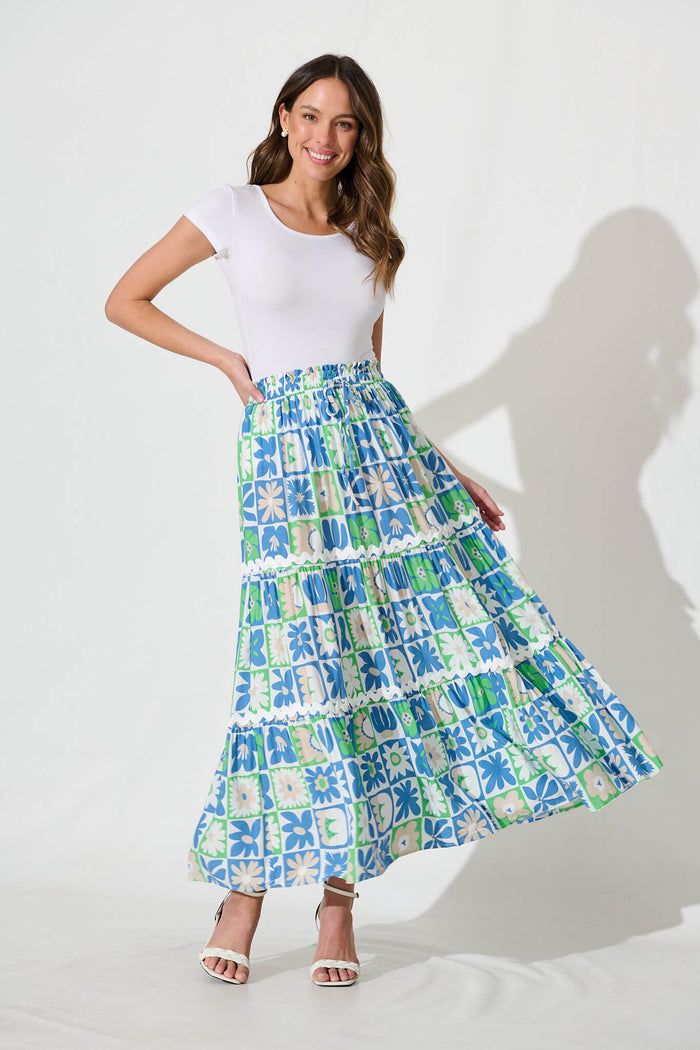 Freedom Maxi Skirt In Blue Print With White Ric Rac Trim