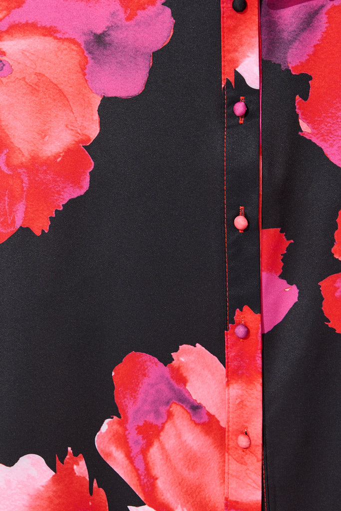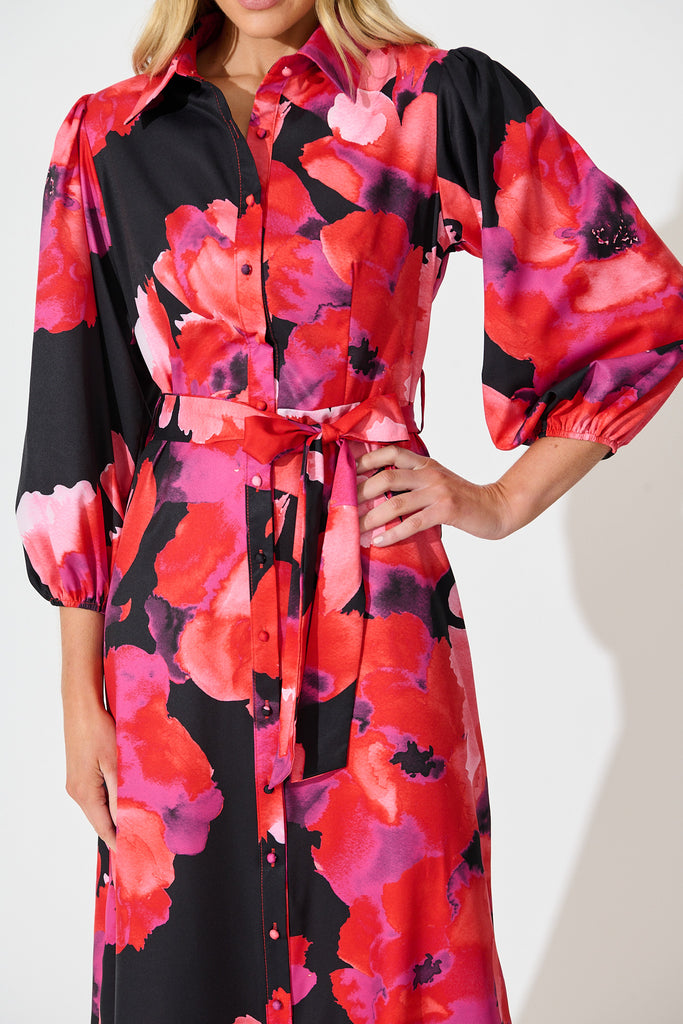 Gabi Maxi Shirt Dress In Black with Berry Watercolour Floral