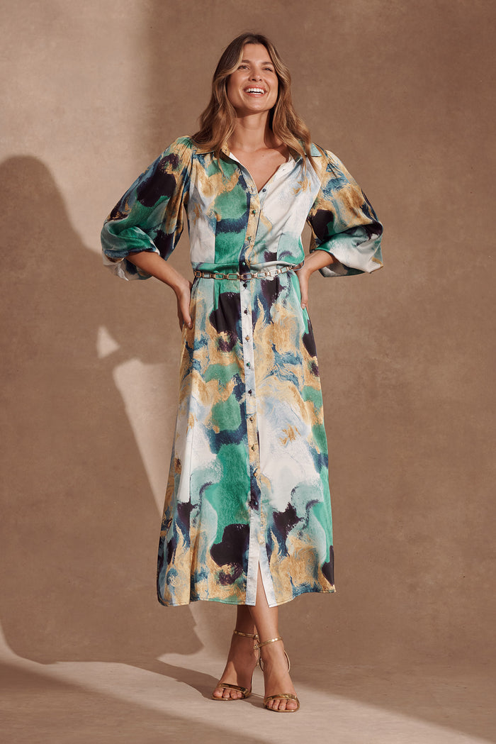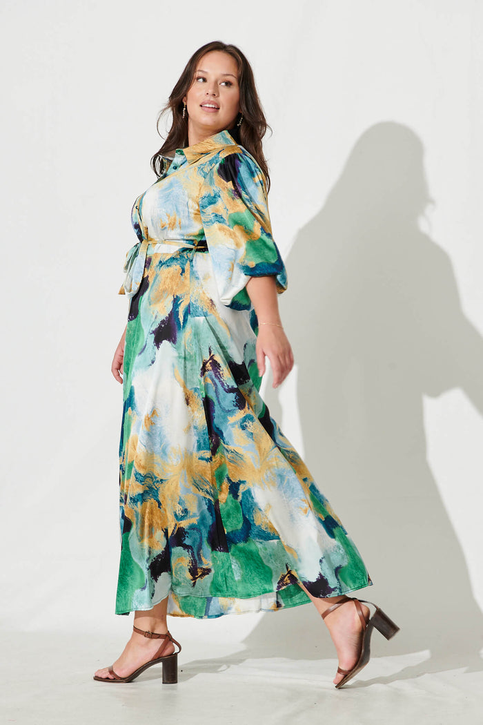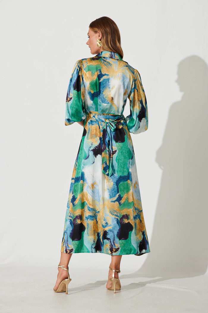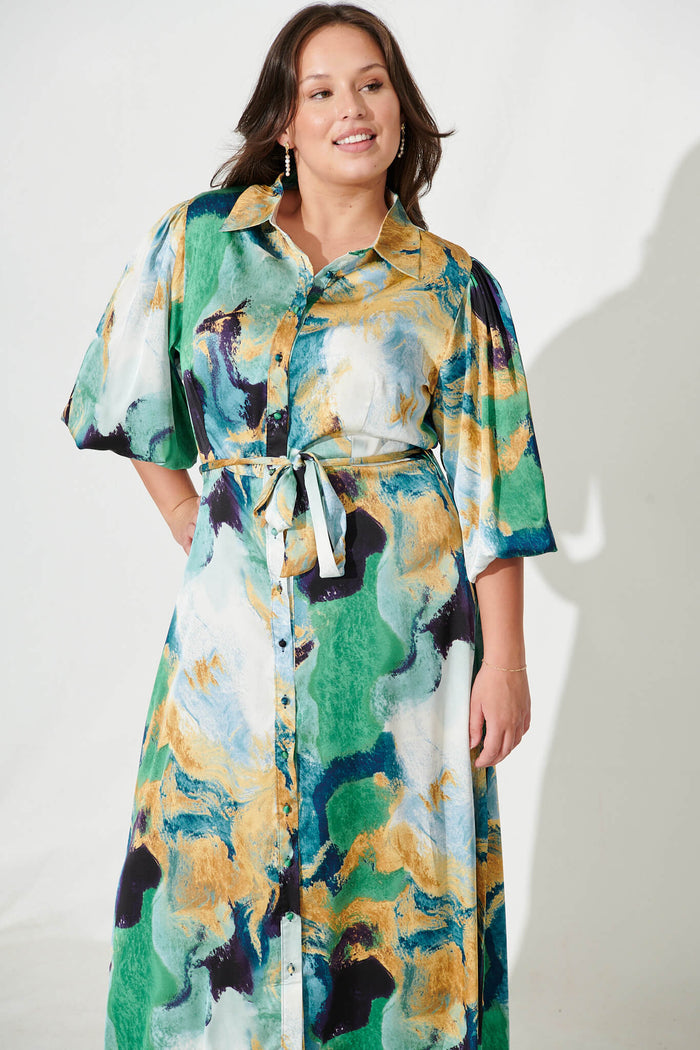 Gabi Maxi Shirt Dress In Blue Green Watercolour