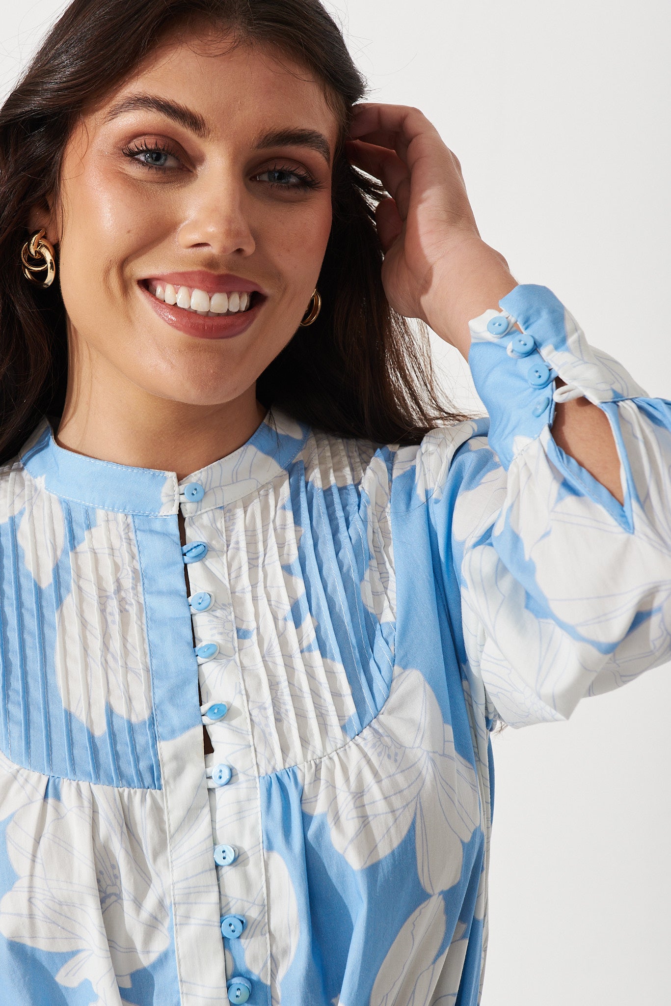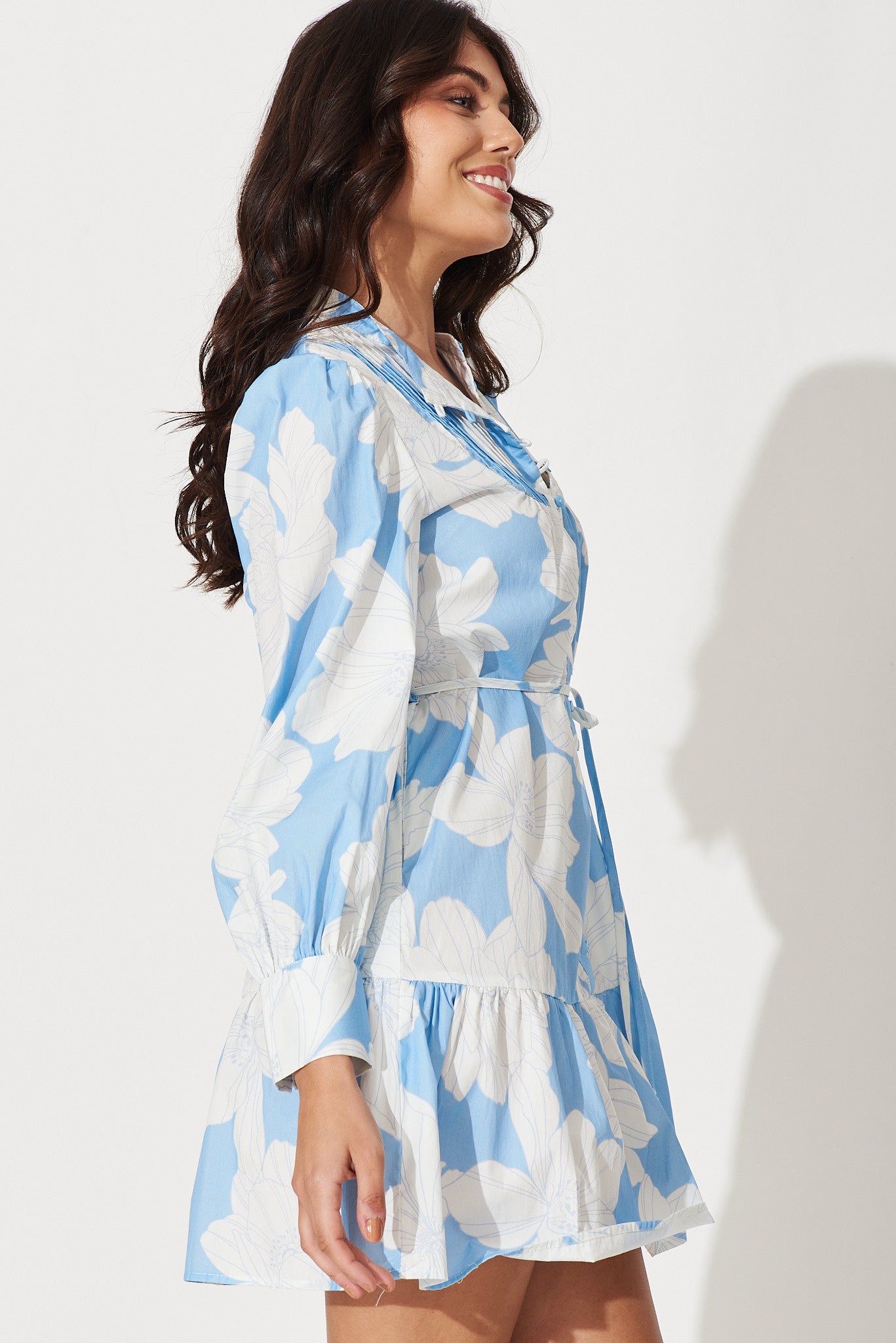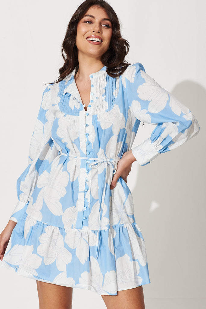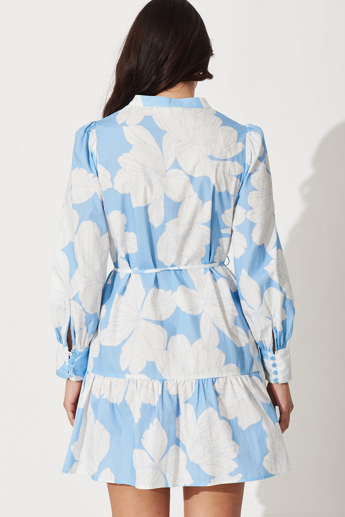 Gal Dress In Pale Blue With White Floral Print Cotton