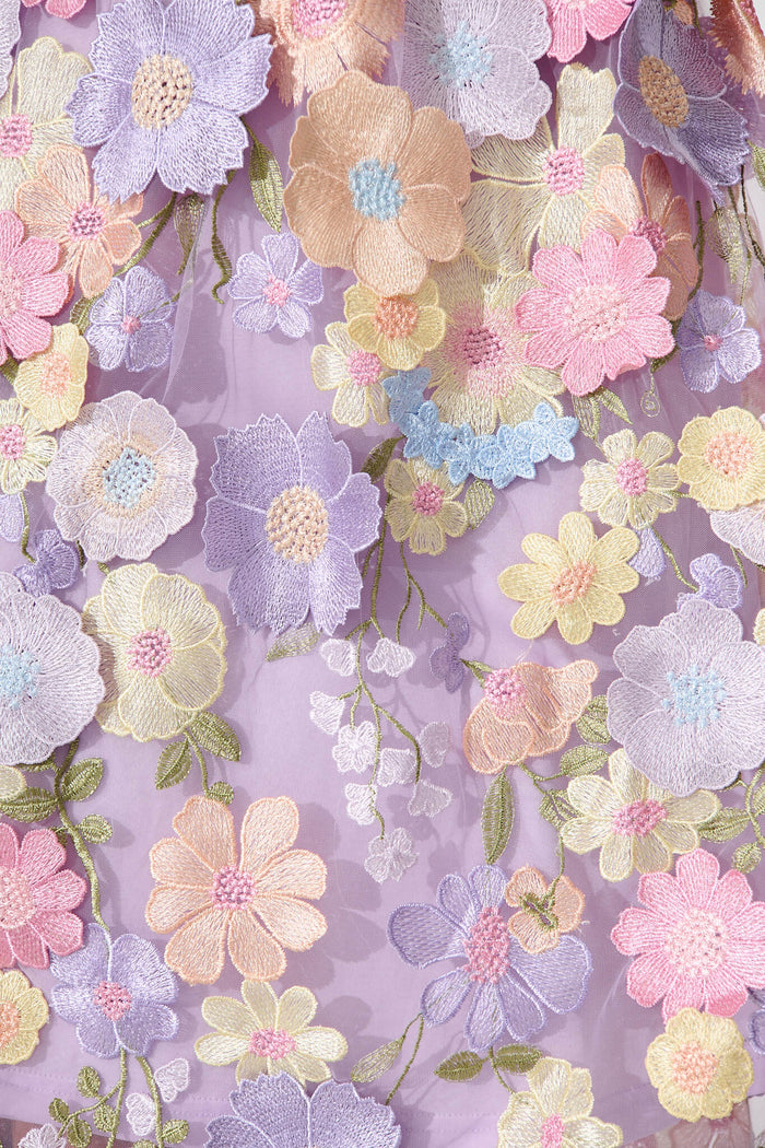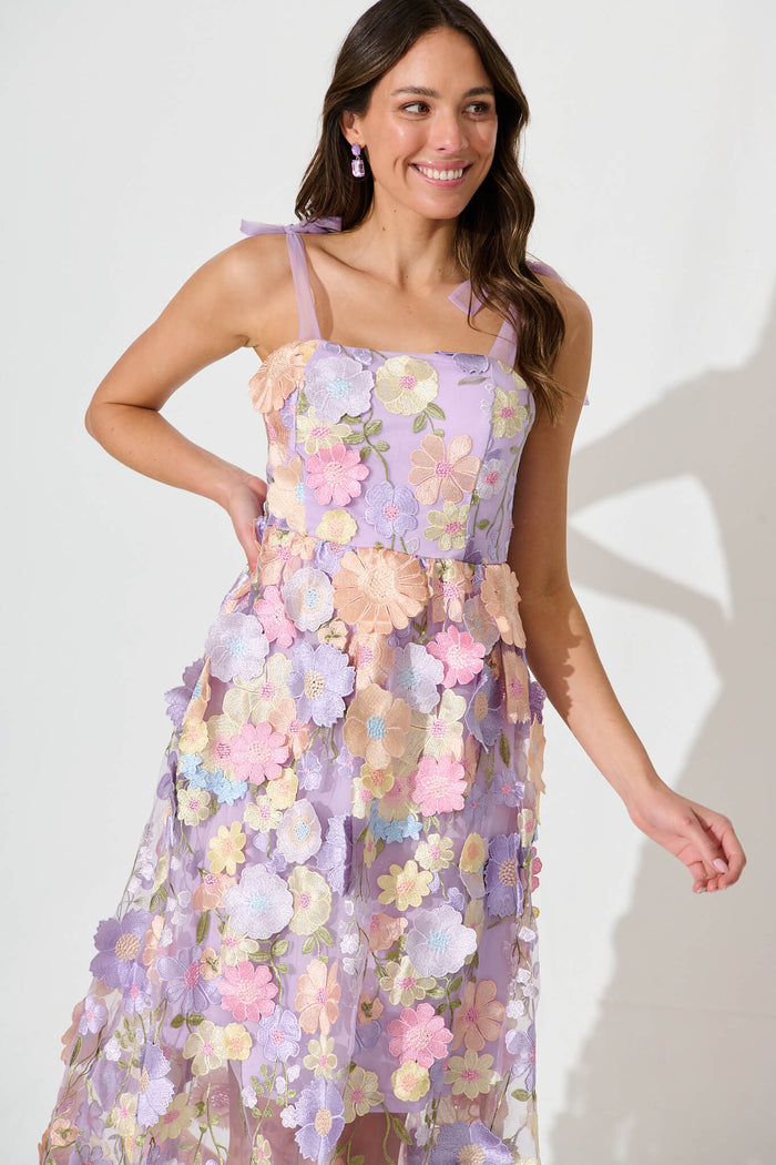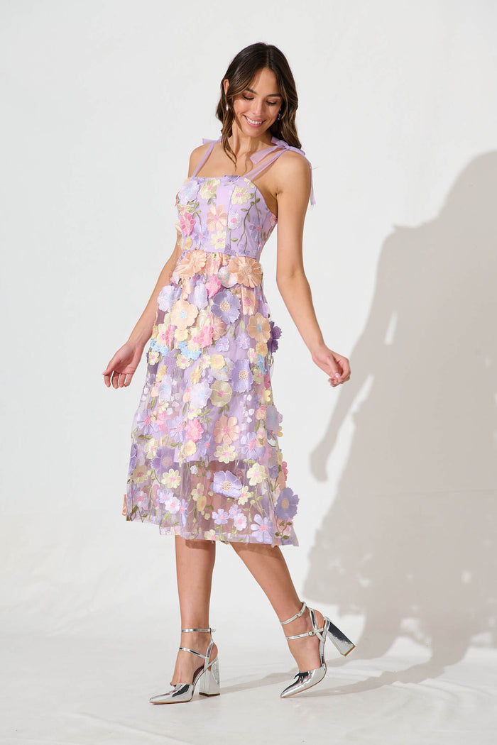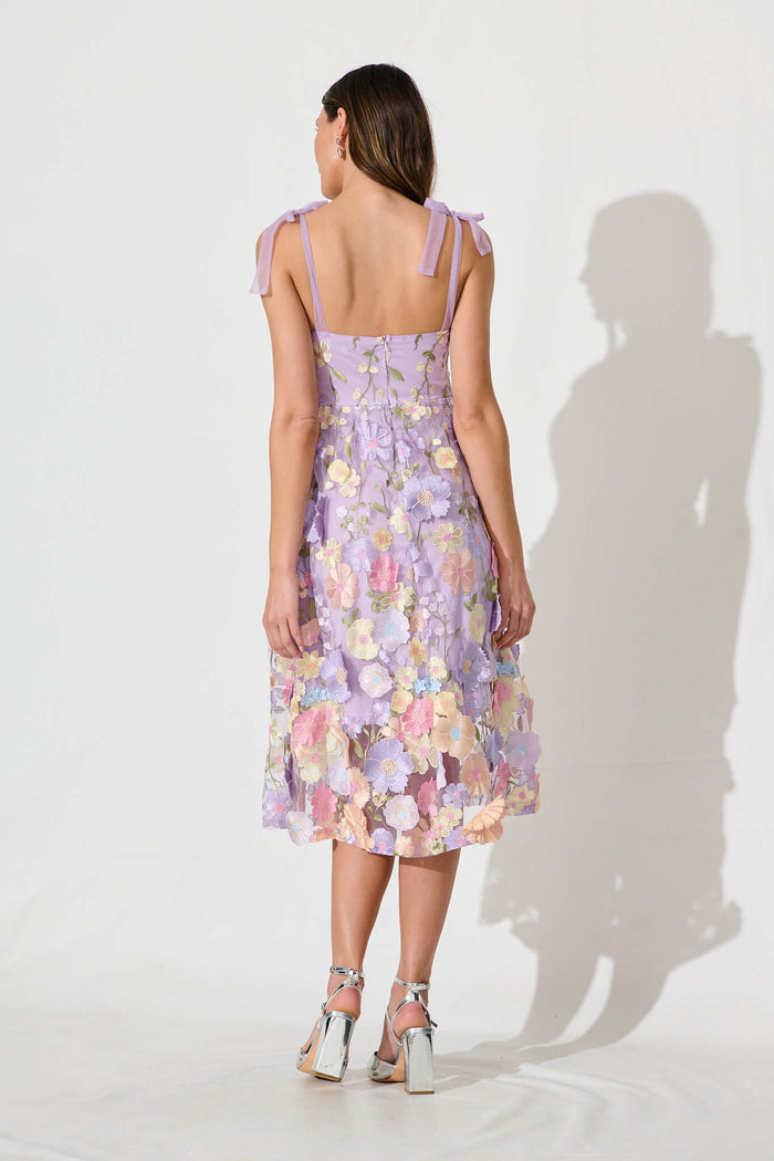 Garden Of Time Midi Dress In Lilac Floral Embroidered Tulle