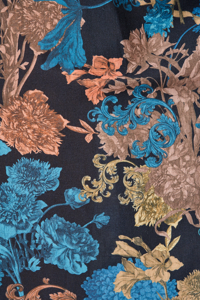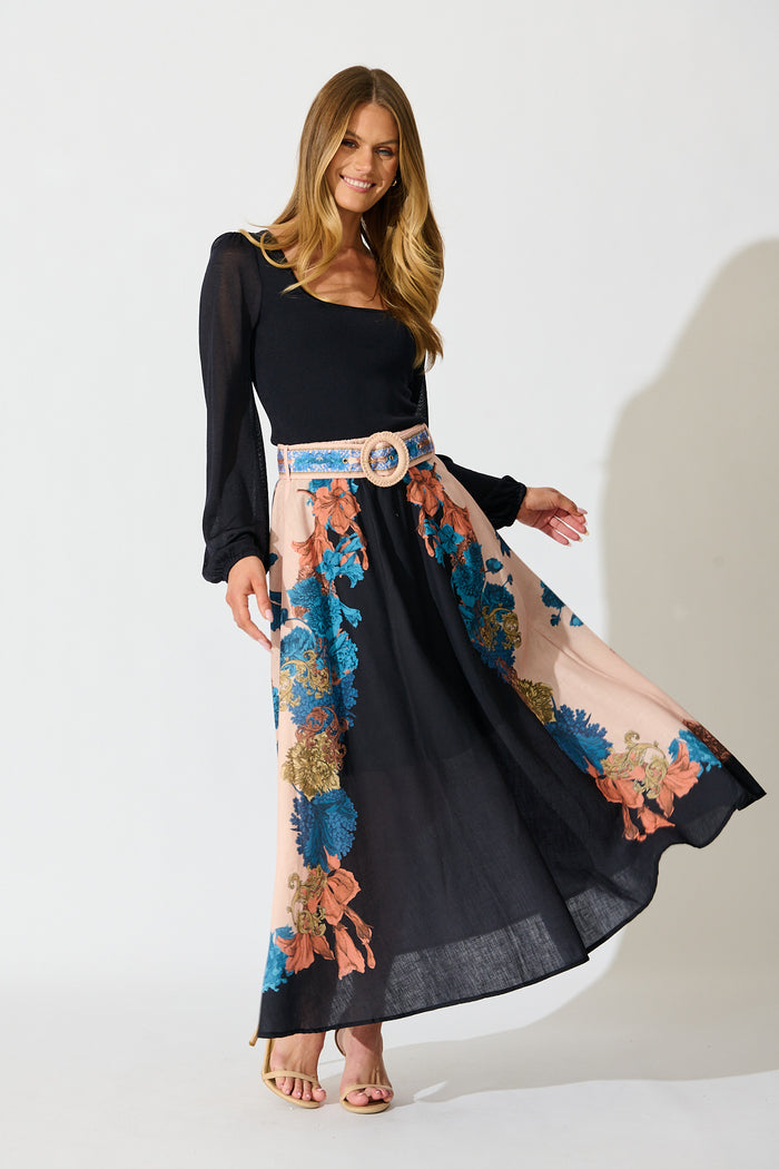 Garden Whispers Midi Dress in Black Multi Floral Linen Blend