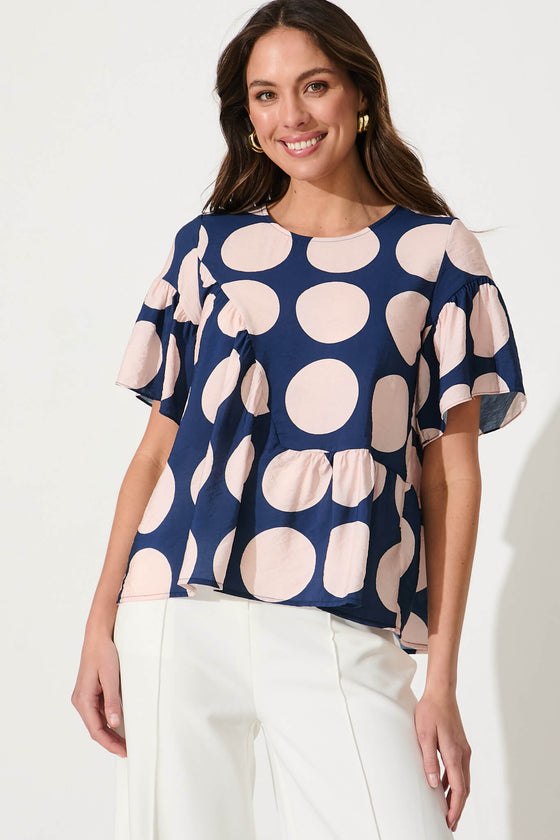 Girona Top In Navy With Blush Spot Cotton Blend