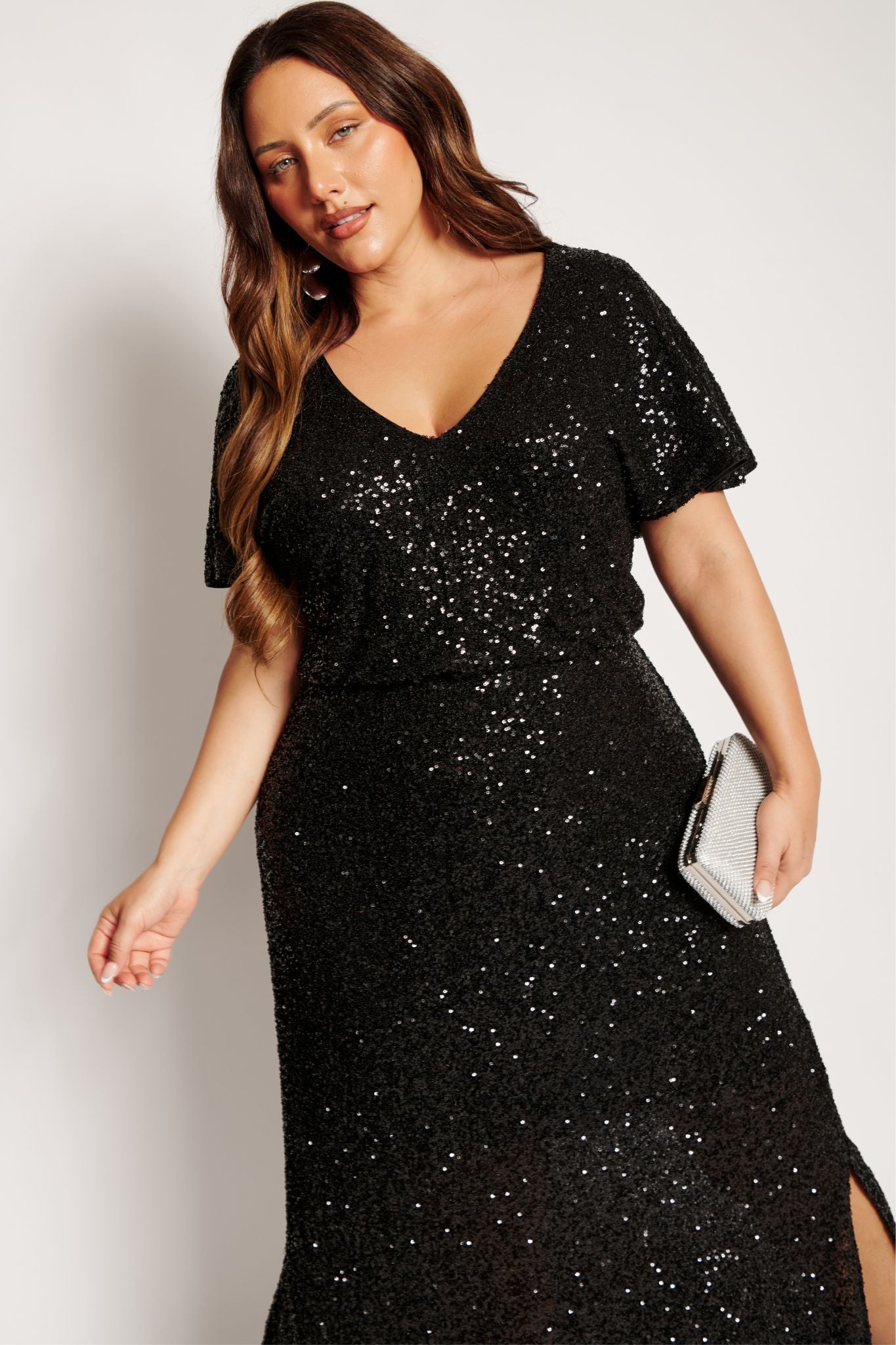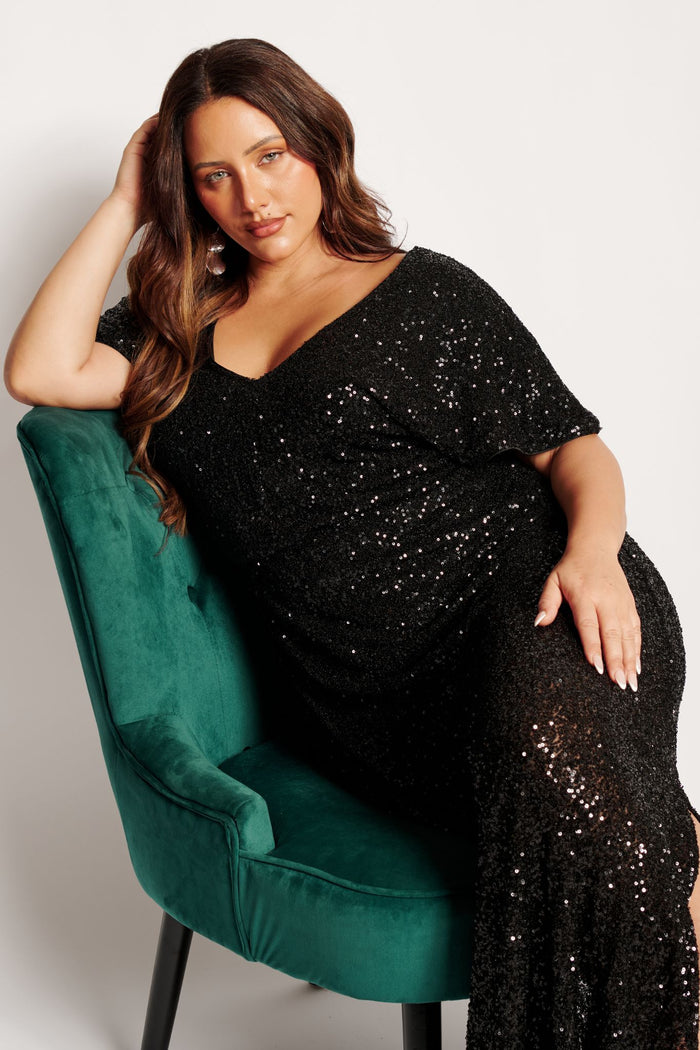 The Glistening Hour Reversible Maxi Dress in Black Sequin offers two looks in one. With its shimmering fabric and versatile neckline, it’s your secret weapon for any special occasion.