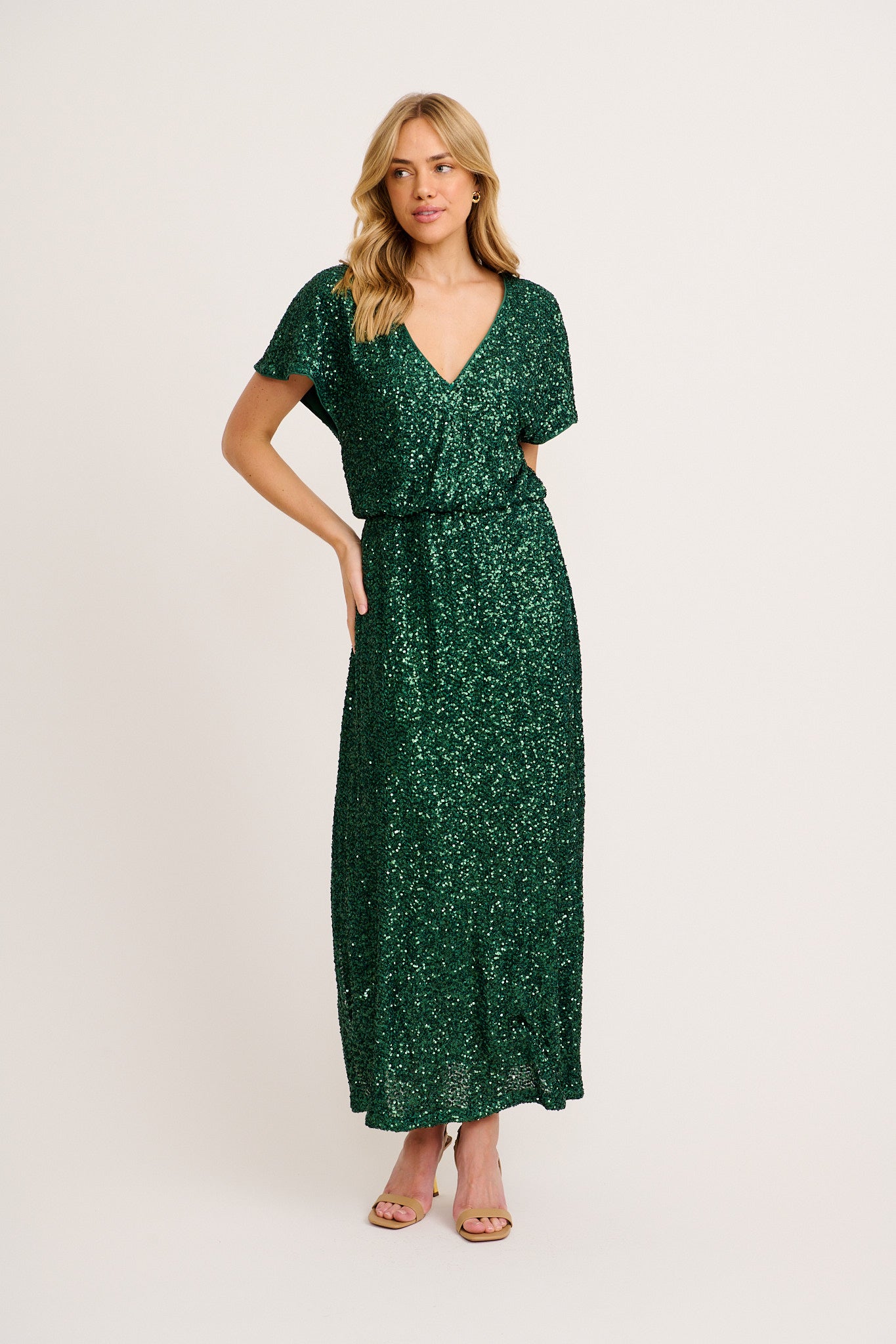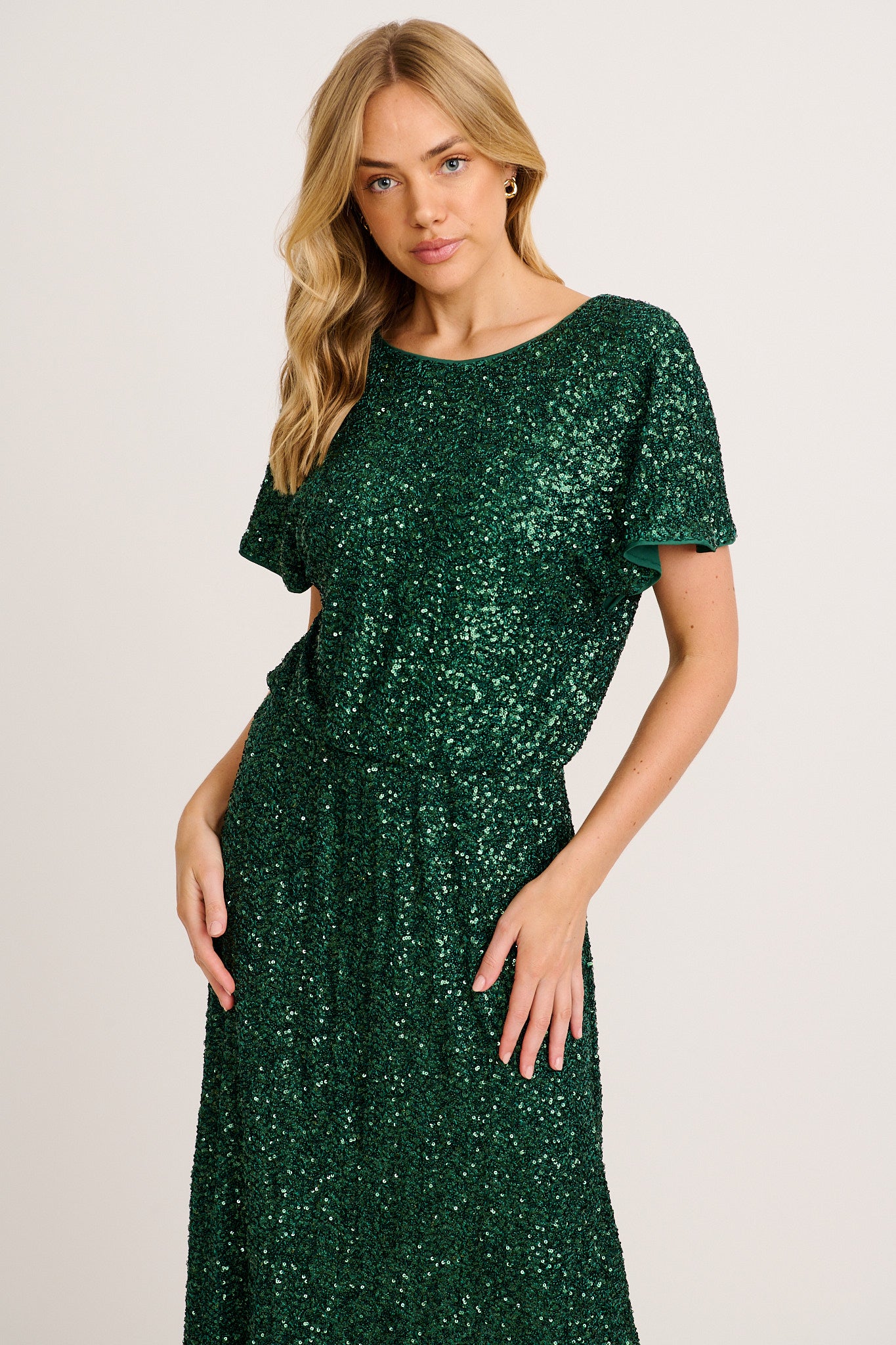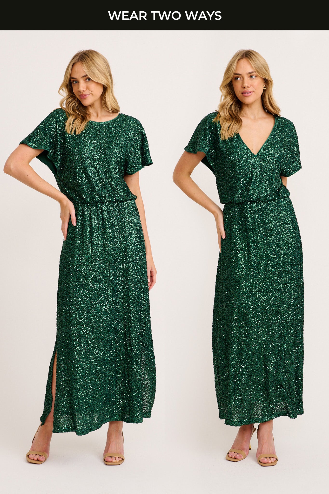 The Glistening Hour Reversible Maxi Dress in Emerald Sequin blends flexibility with sparkle. Choose between two neckline options in this shimmering showstopper, perfect for elegant evenings or festive celebrations.