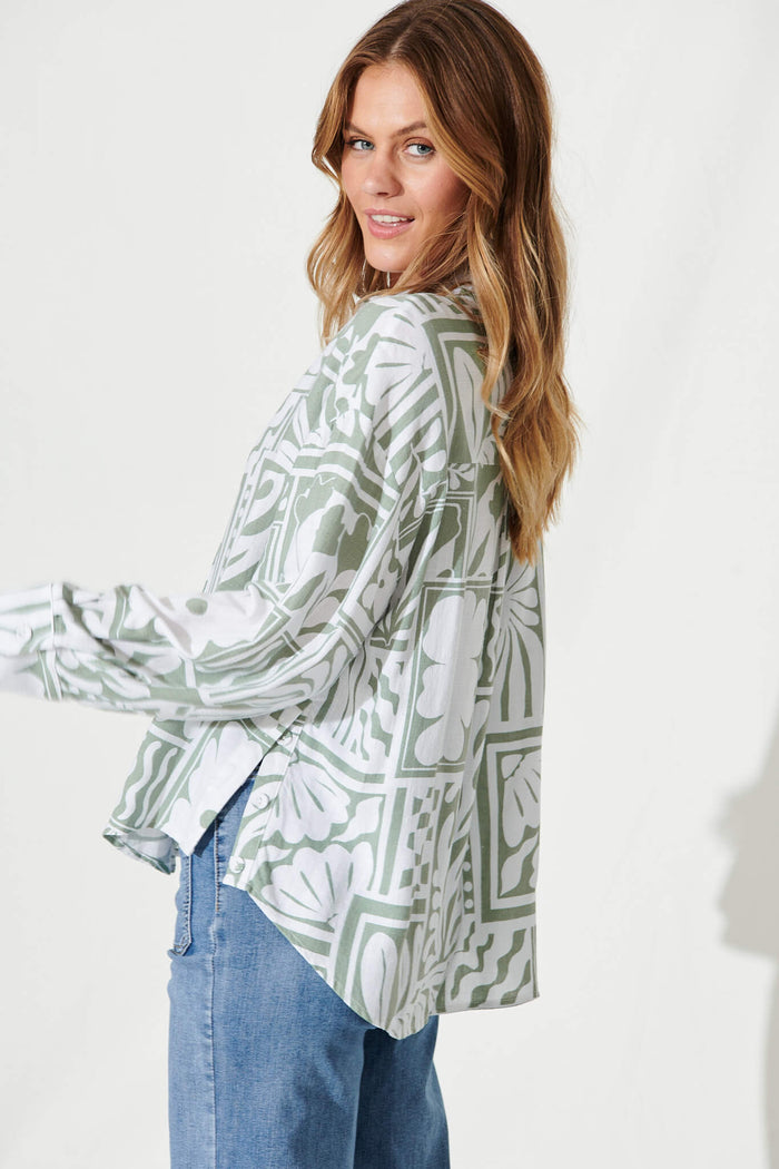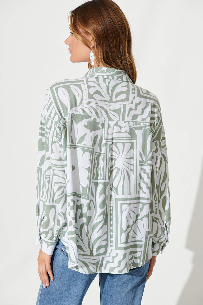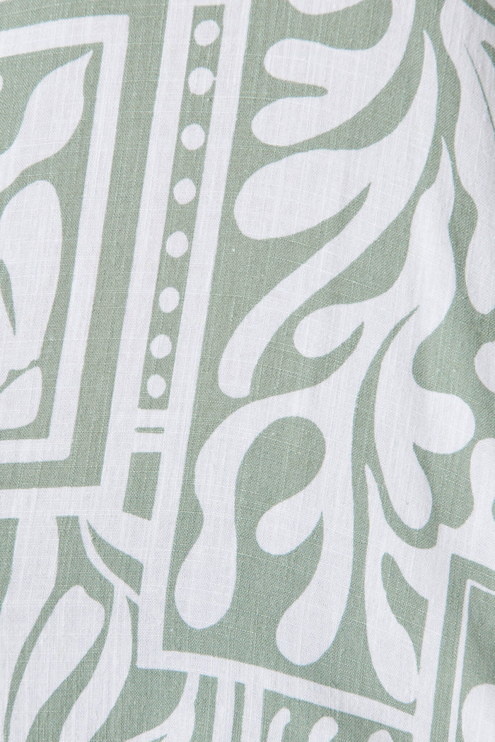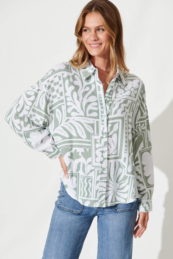 Gwendolyn Shirt In White With Sage Abstract Linen Blend