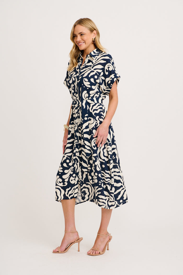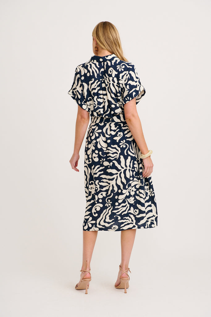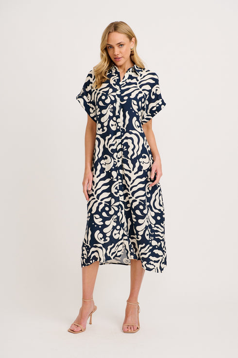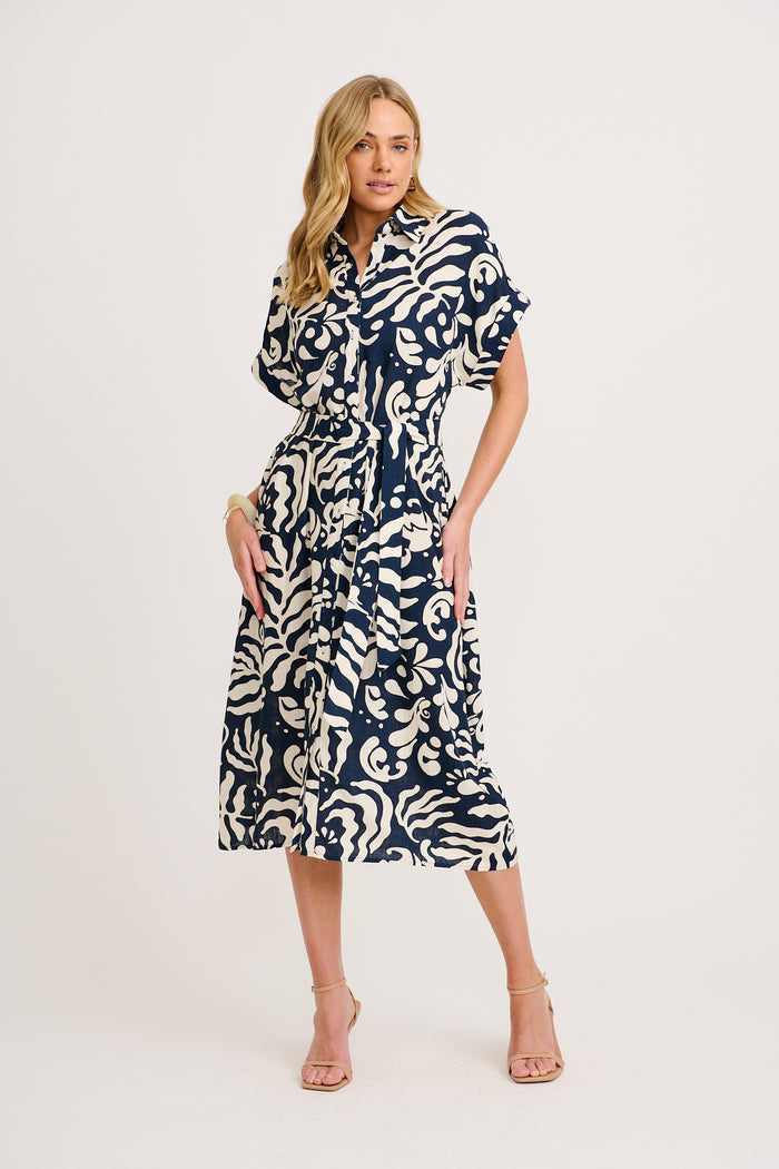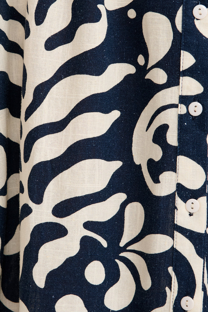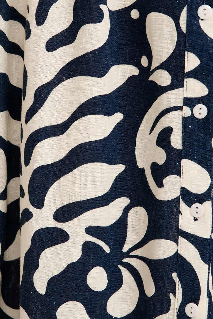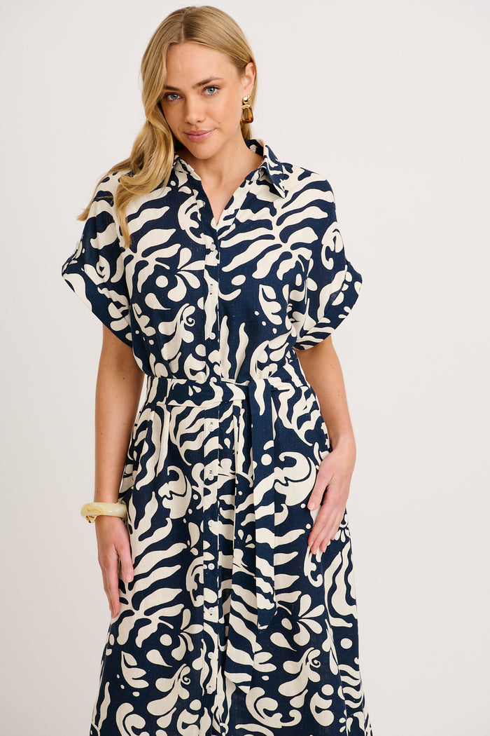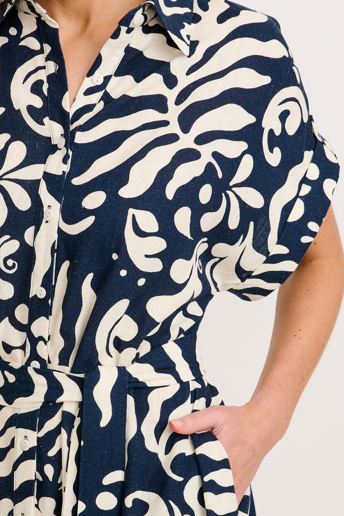 Hartlee Midi Shirt Dress in Navy and Cream Leaf Linen Blend