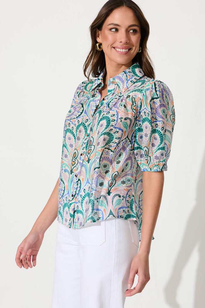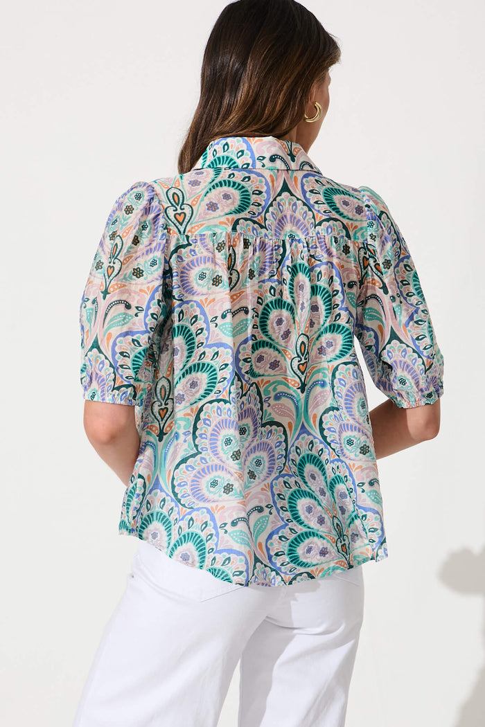 Our Haruna Shirt in Green Multi Paisley is a feminine and stylish piece perfect for any occasion! The lightweight, non-stretch fabric and functional button front make it comfortable and easy to wear. The vibrant floral print adds a touch of personality and charm.