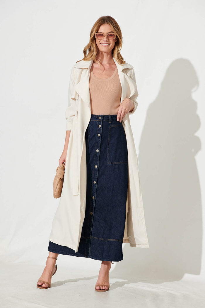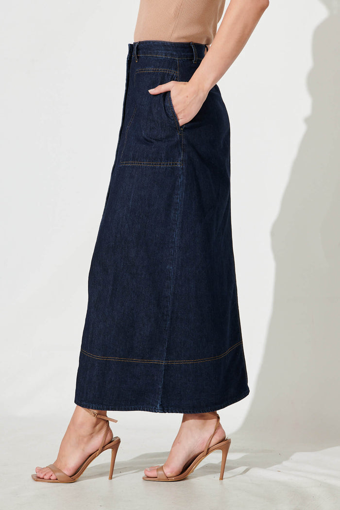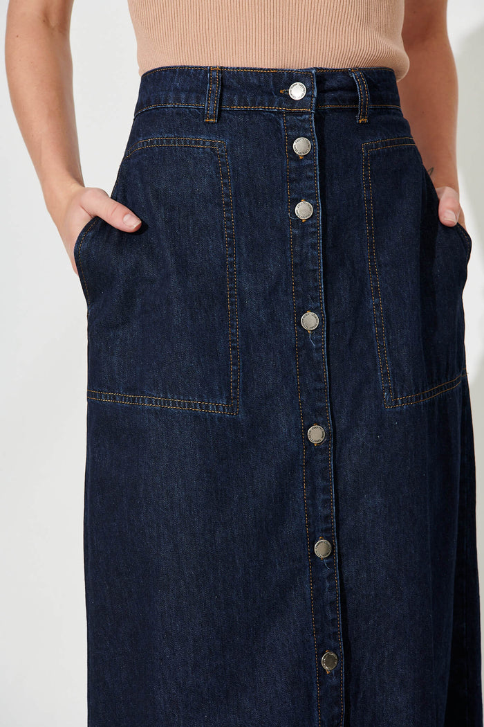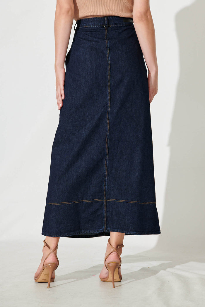 Introducing our Hayden Maxi Denim Skirt. The perfect addition to your wardrobe. Whether you're dressing up for a night out or keeping it casual for day wear, the Hayden skirt will effortlessly see you through the seasons. Style it with a fitted knit top, ankle boot or strappy sandal depending on the occasion.