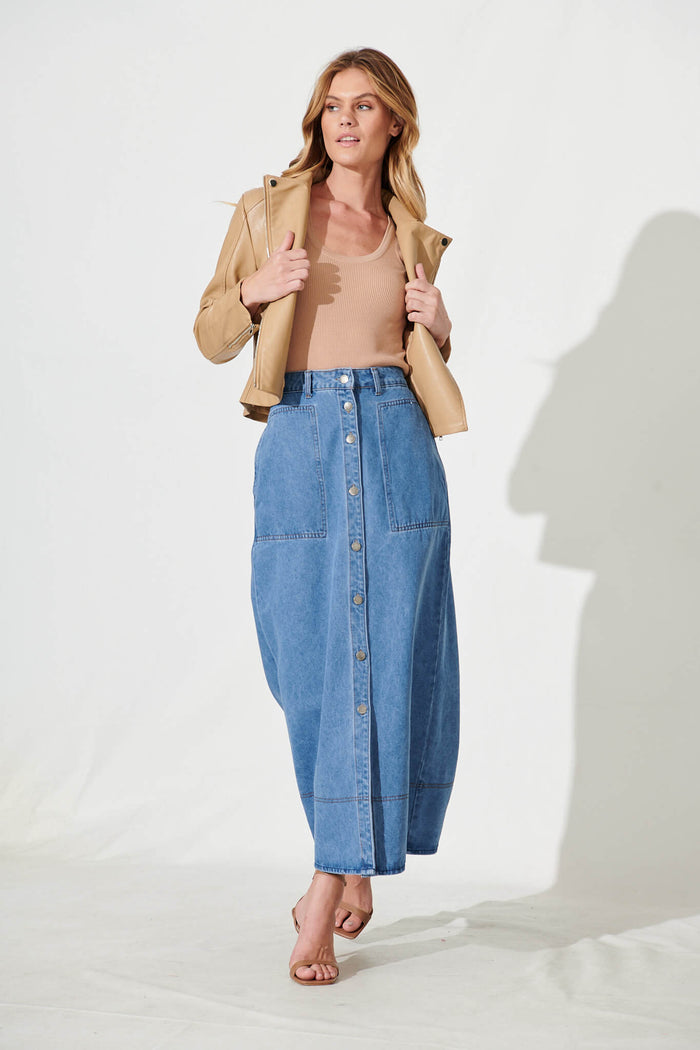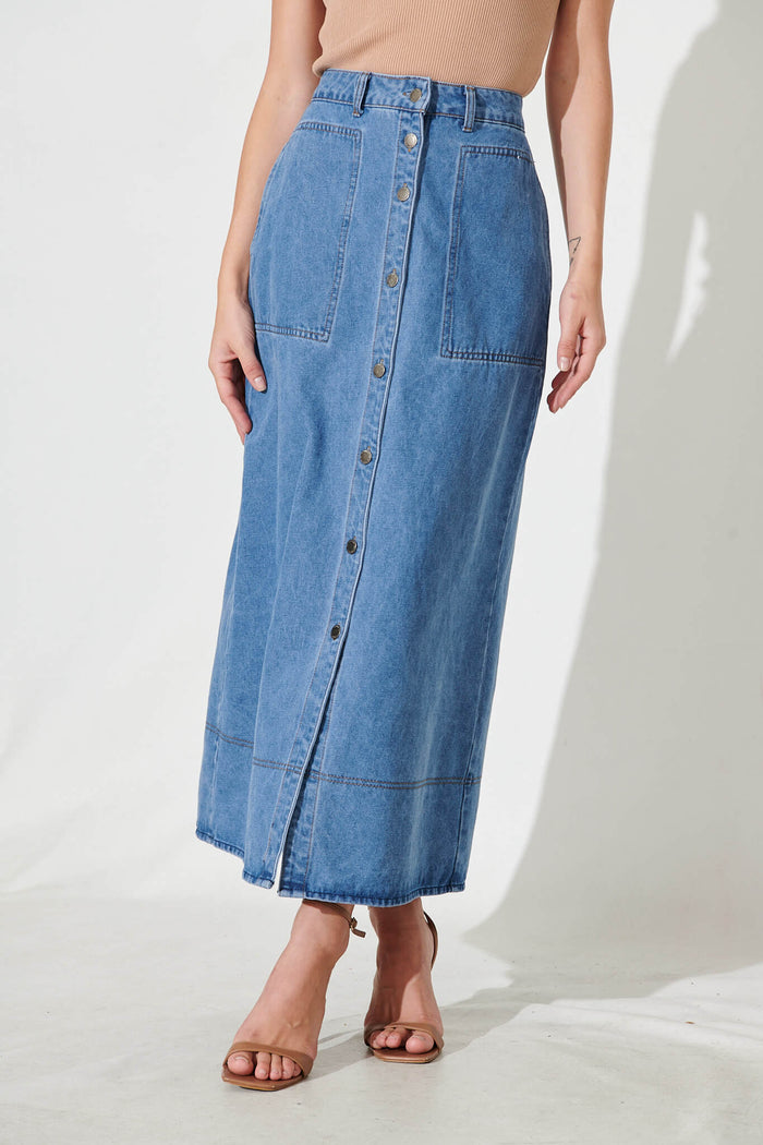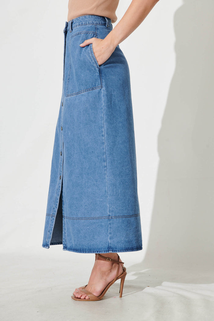 Hayden Maxi Denim Skirt In Mid Blue