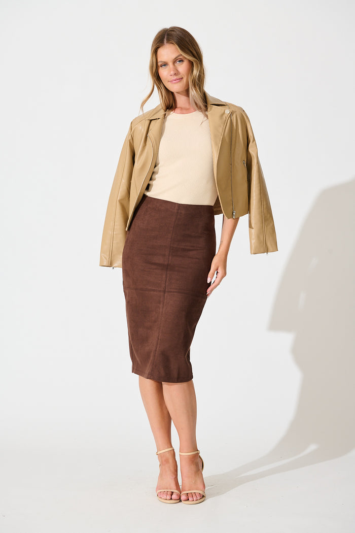 Embrace easy elegance when wearing our Hold Tight Midi Skirt. This easy to wear midi was made to flatter your figure, while the suedette fabrication makes for a stylish finish! Wear with a lightweight knit and sneakers for a casual cool outfit!