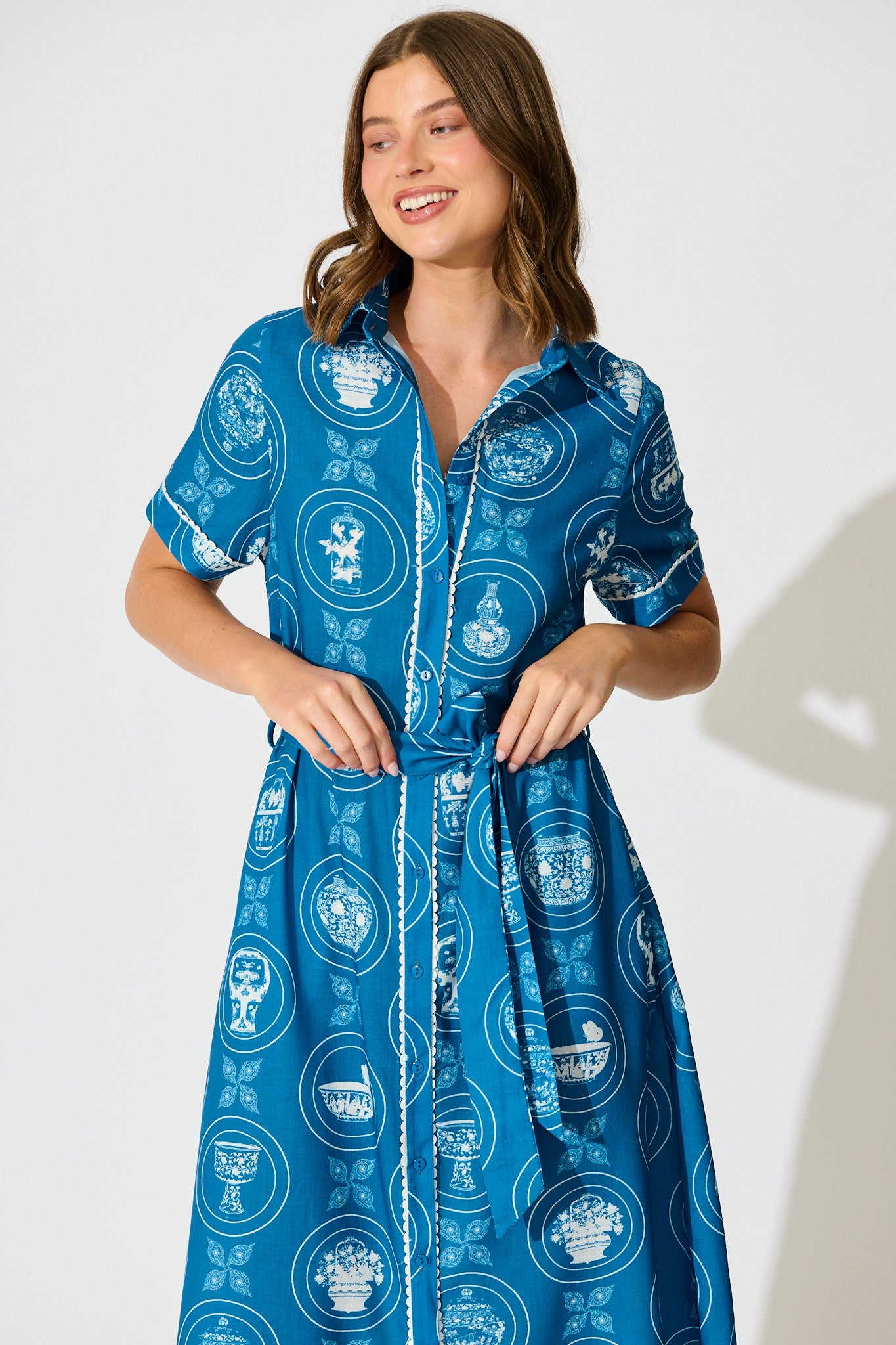 Hope Midi Shirt Dress in Blue Tiles Linen Blend