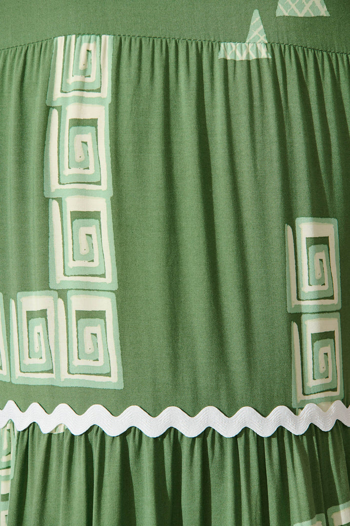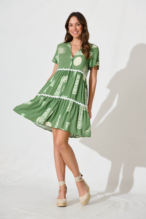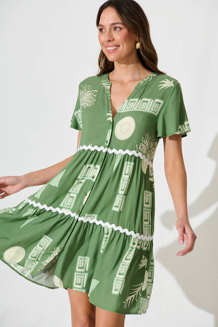 Island Dreams Smock Dress In Green With White Ric Rac Trim
