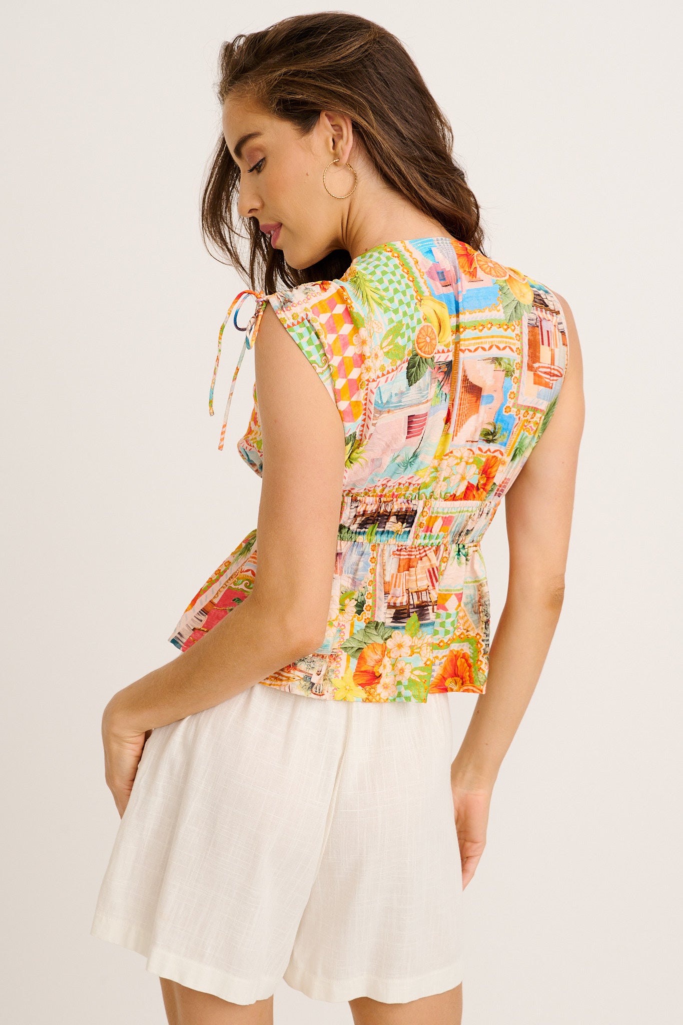 Add a hit of holiday charm to your wardrobe with the Island Sway Top in Multi Postcard Print. This standout sleeveless style brings sunshine vibes in a wearable, flattering shape made for weekends, vacays, or day-to-night looks.
