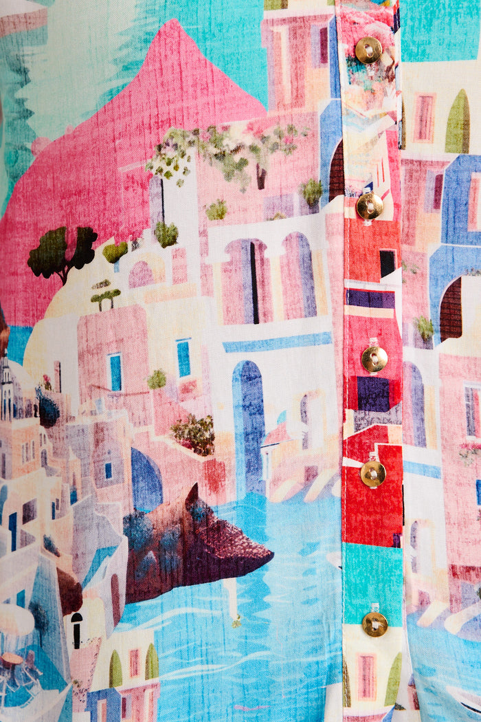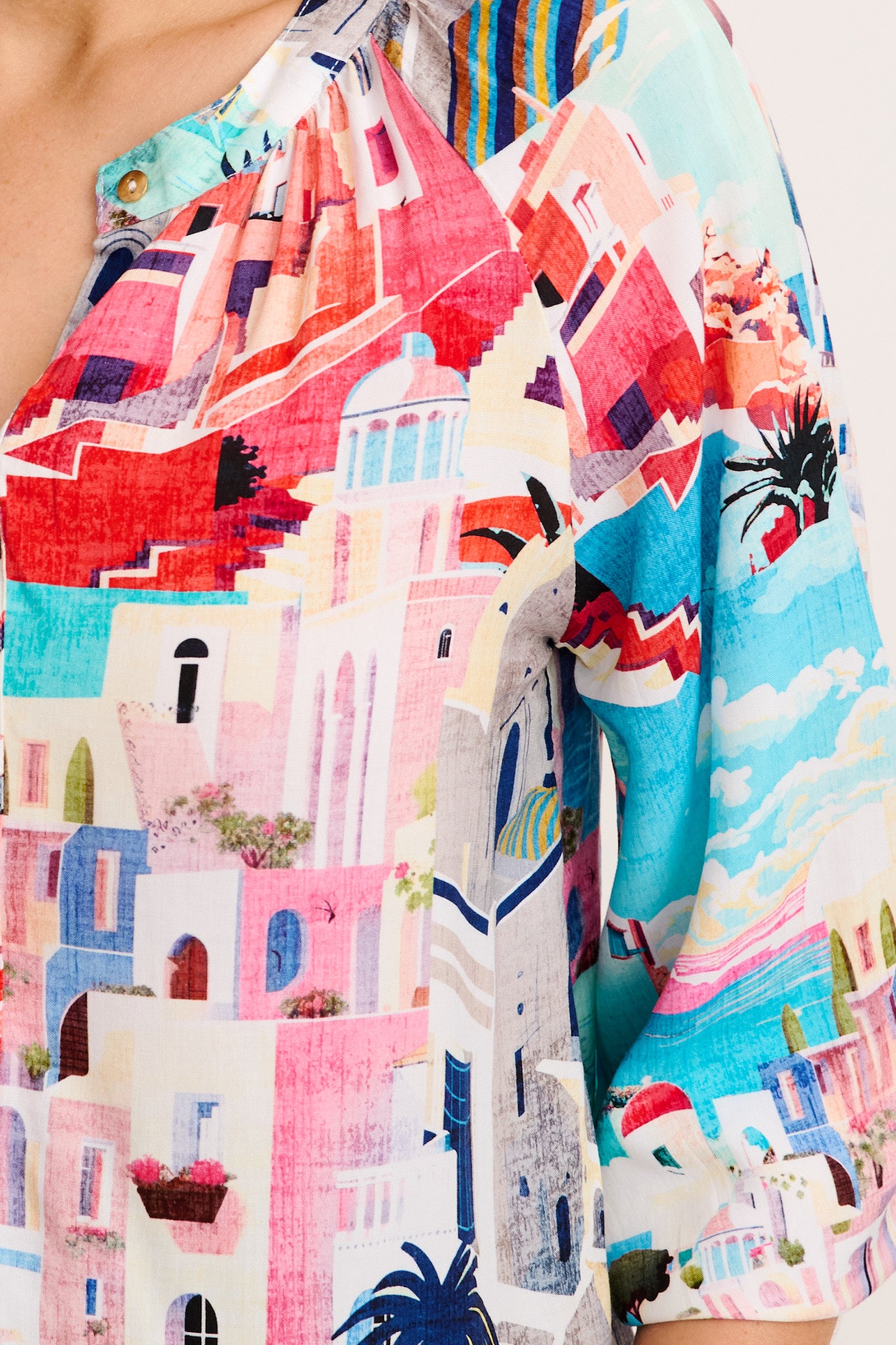 With its lightweight, breathable rayon fabrication and relaxed fit, this top feels like a dream on the skin. The colourful abstract print gives it that laidback-luxe vibe, while gold buttons and a mandarin collar elevate the look with polished details. The raglan sleeves feature encased elastic at the wrists, giving just the right amount of structure and movement. A softly curved hemline allows for an easy tuck or a flattering flow when worn loose.