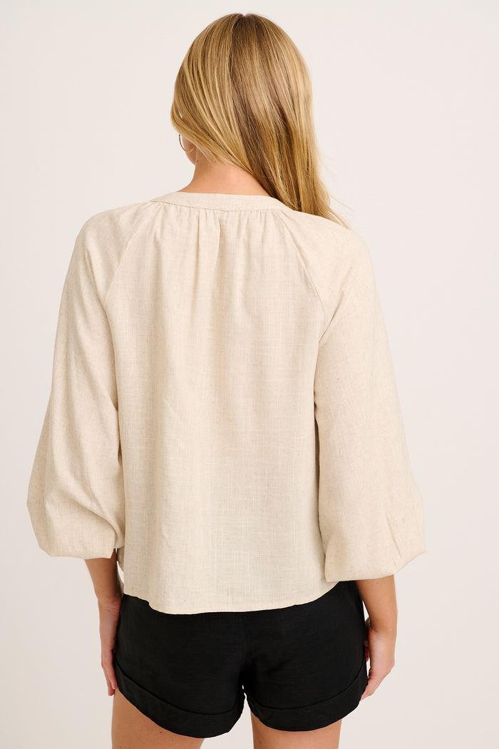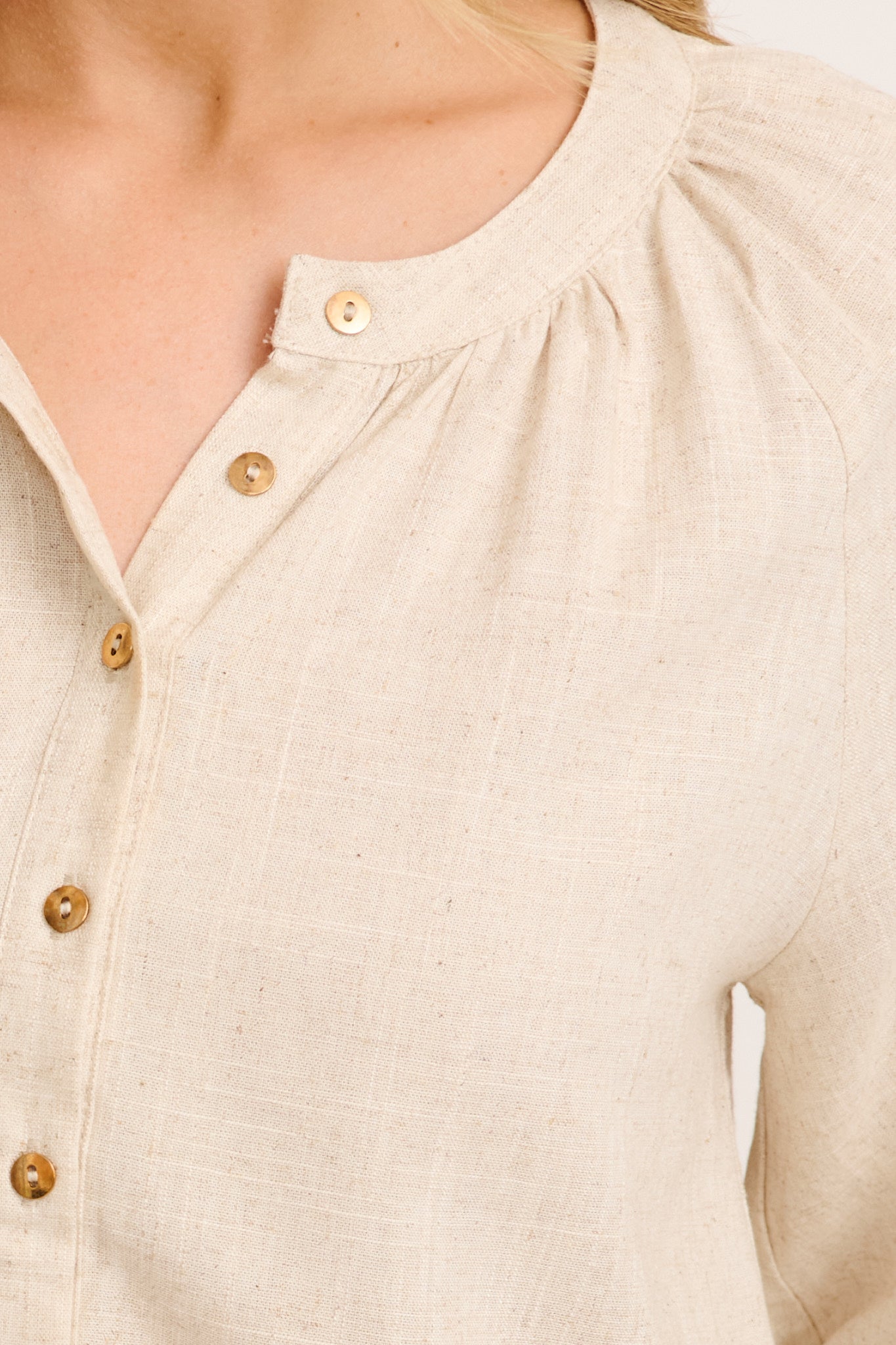 A mandarin collar and gold button front give a subtle nod to timeless tailoring, while raglan sleeves and encased elastic cuffs deliver freedom of movement and a gently relaxed fit. The curved hemline means you can style it tucked in or worn loose, making it endlessly versatile for work or weekends. As part of our Get The Linen Look and Vacation Edit, this piece is a true wardrobe staple.