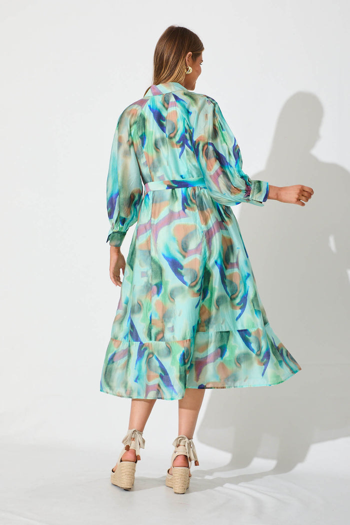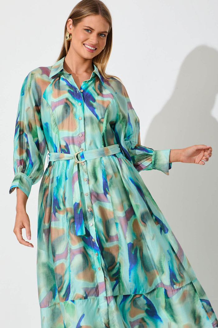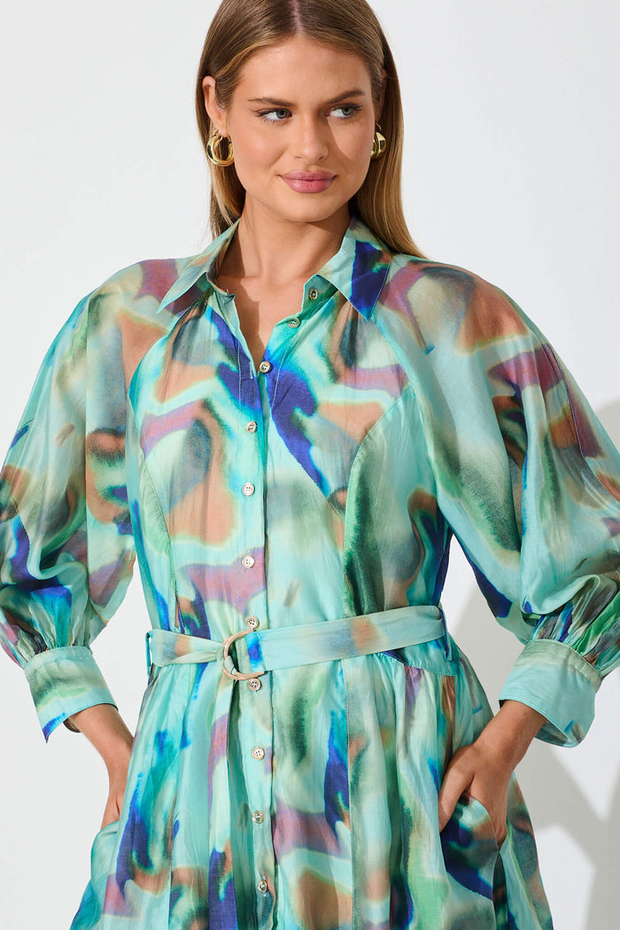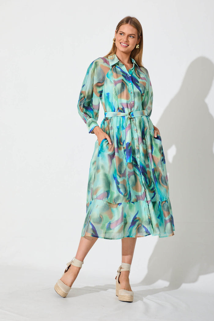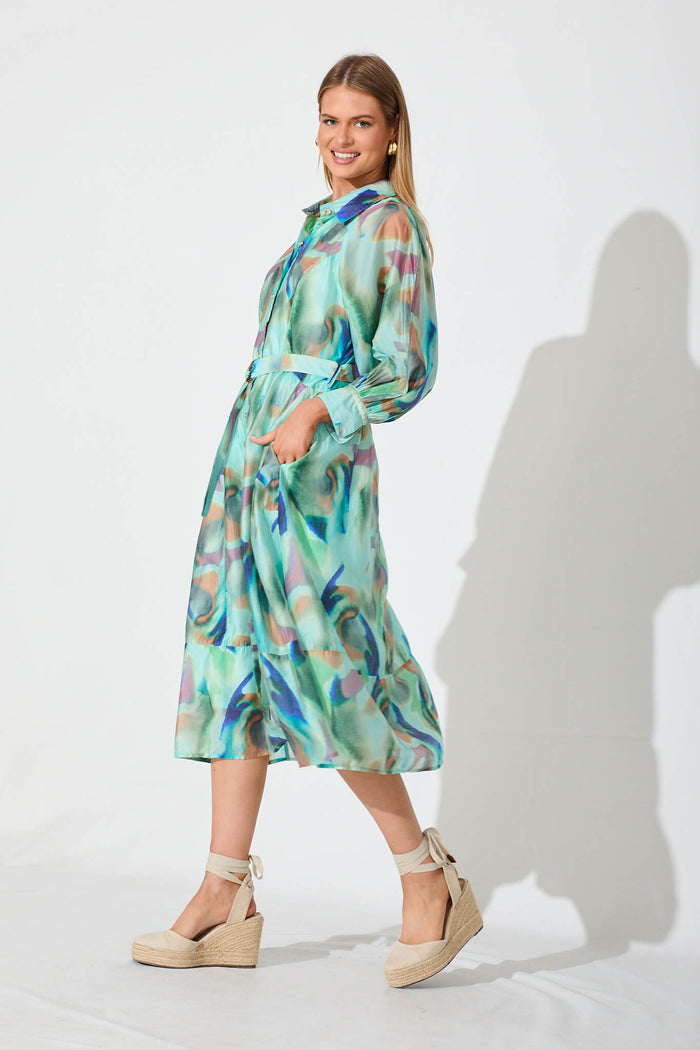 Jenna Midi Shirt Dress In Green With Multi Cotton Blend