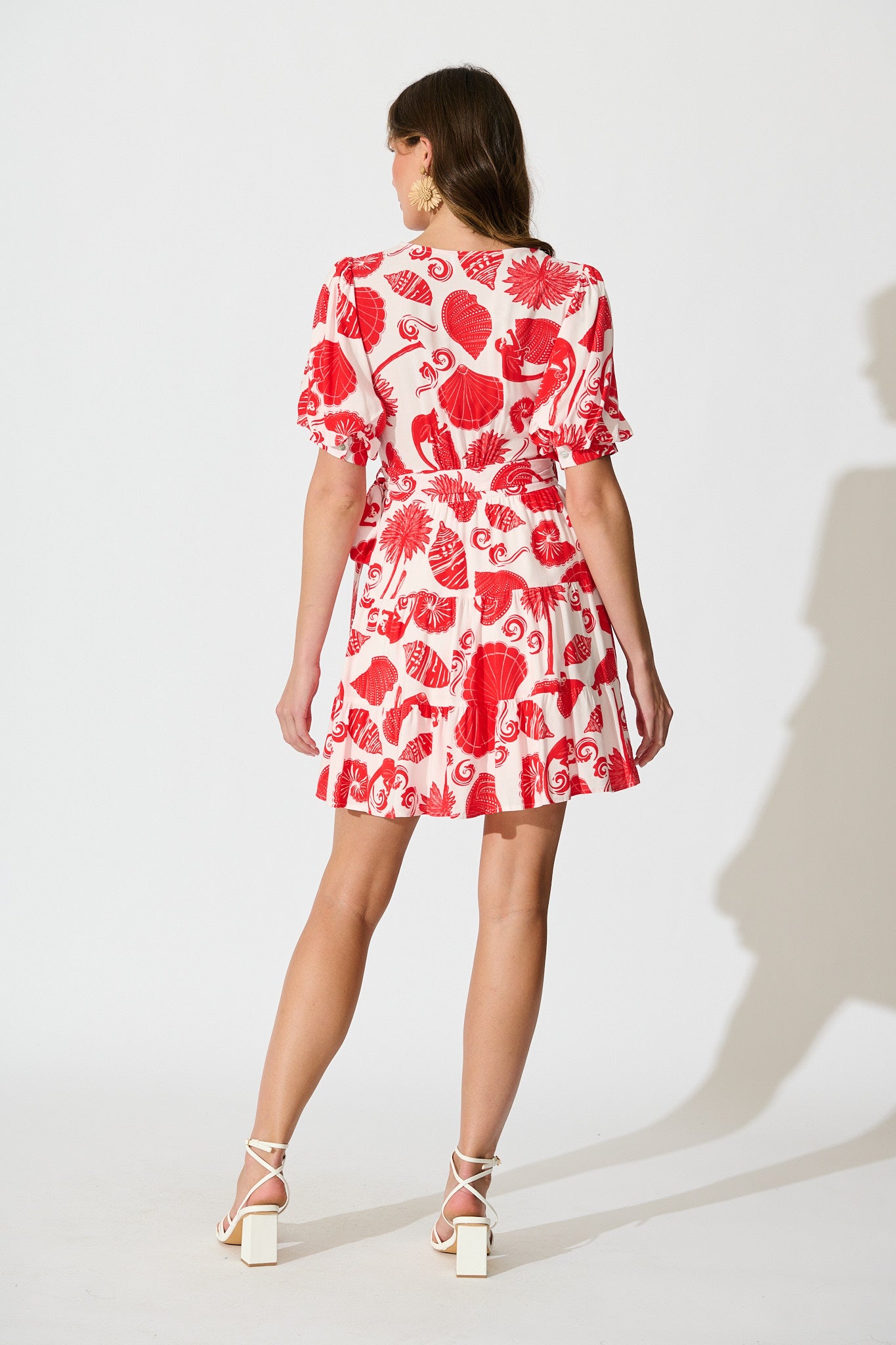 The Katarina Wrap Dress in Off White with Red Shell Print is made for sunny coastal days and long lunches alike. Its flattering wrap shape cinches effortlessly at the waist, while puff sleeves and tiered skirting add a breezy softness.