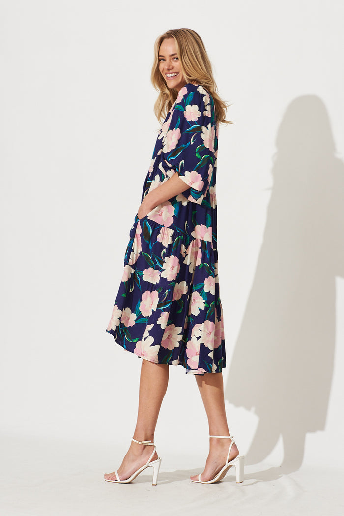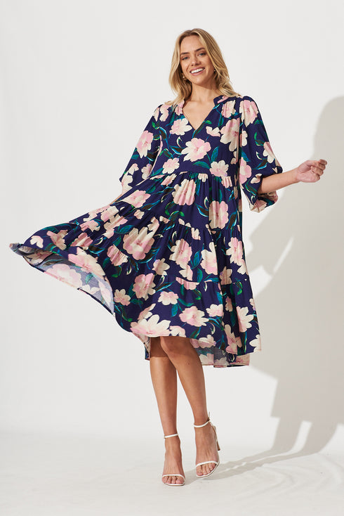 Kehlana Tiered Smock Dress In Navy With Blush Floral