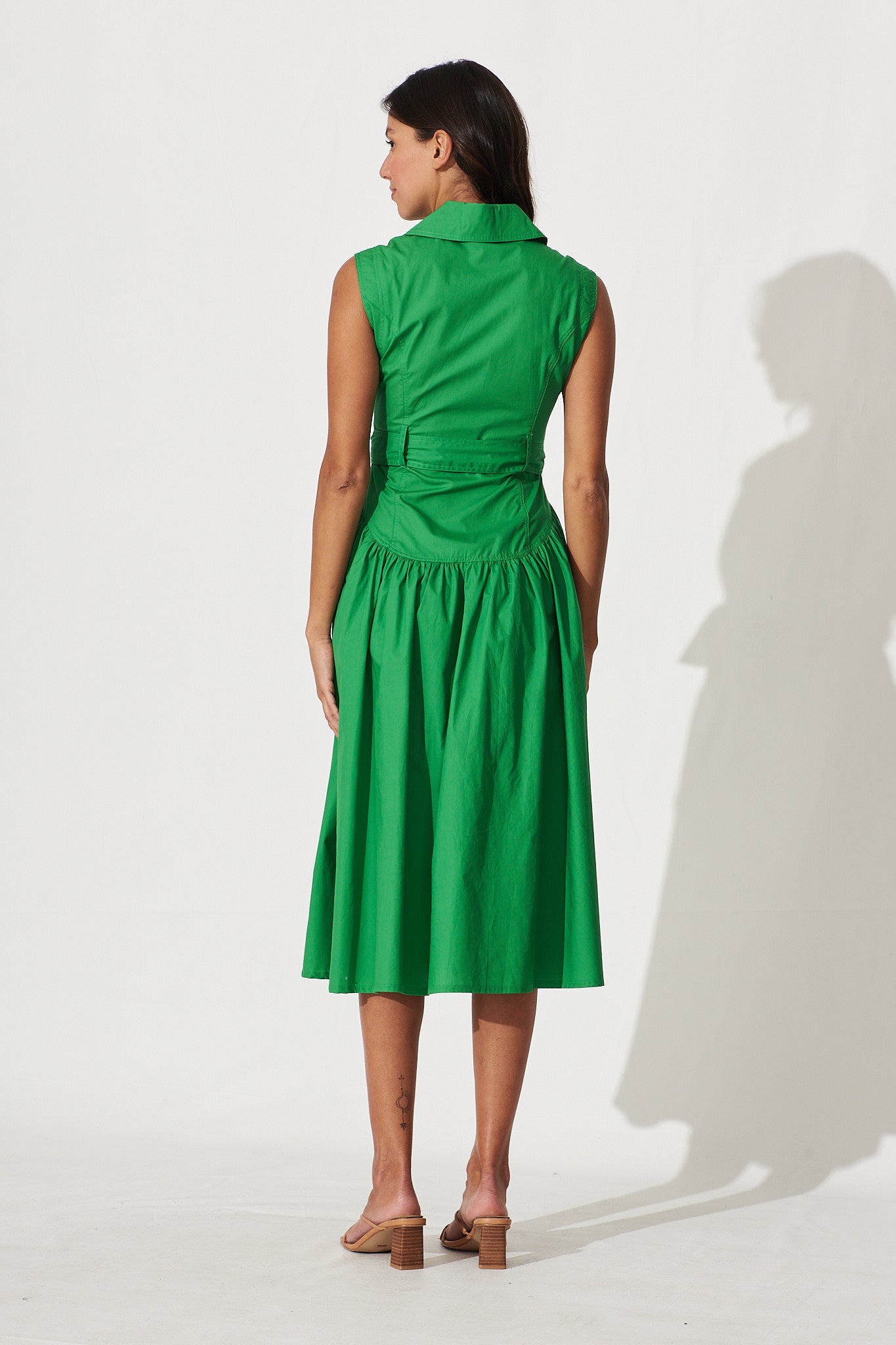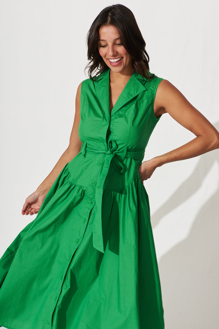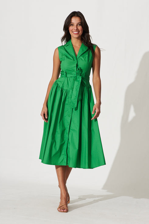 An easy summer classic. Our Kelly Midi Shirt Dress will have you ready for all your warm-weather adventures. Featuring chic collar detail, & waist tie. We love this styled with tan heeled sandals, & cute basket bag to match
