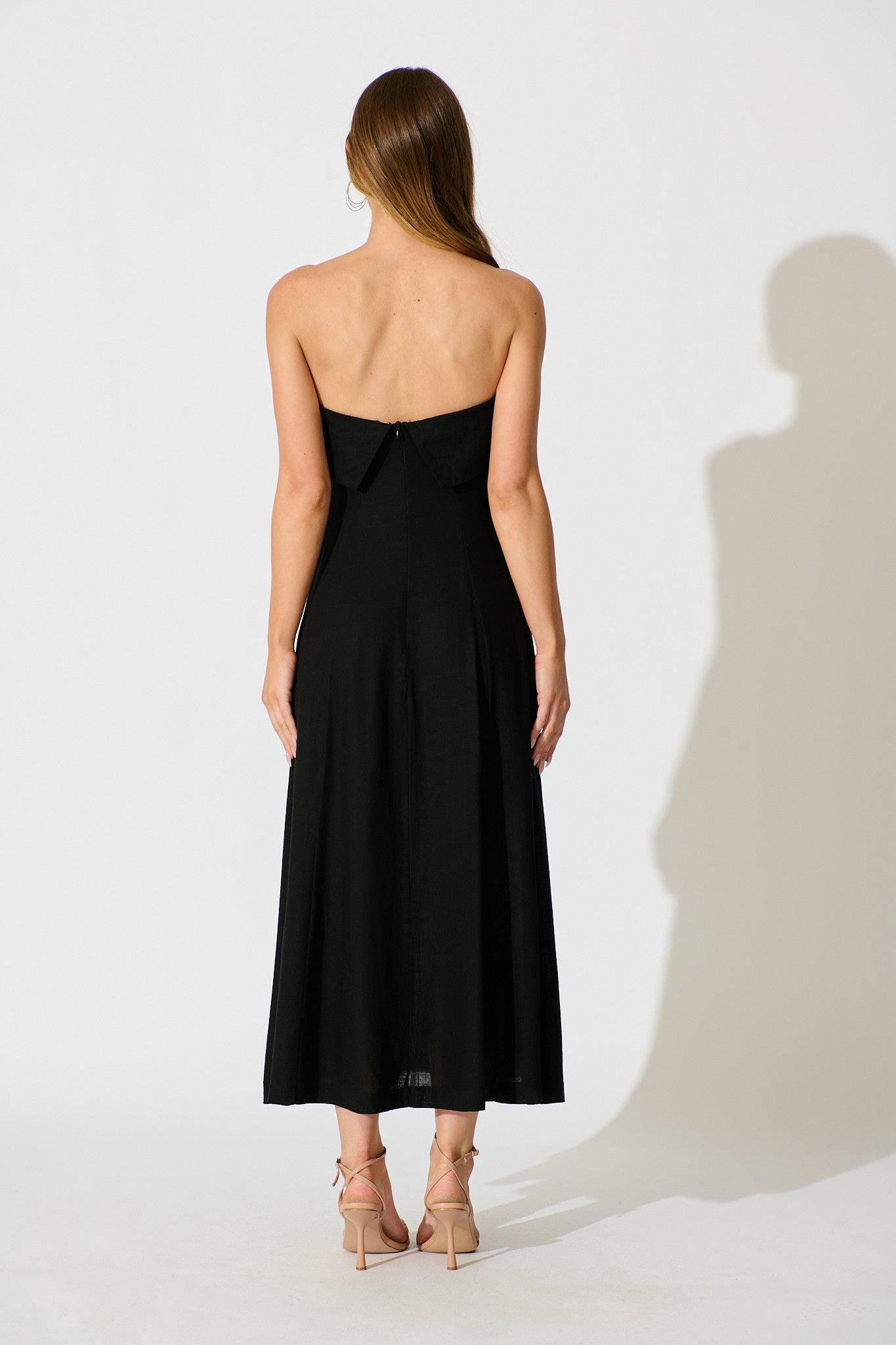 The Kerra Maxi Dress in Black Cotton Linen Blend is an easy classic that transitions beautifully from day to night. With its timeless strapless shape and breathable fabrication, it’s made for sunshine, celebration and everything in between.